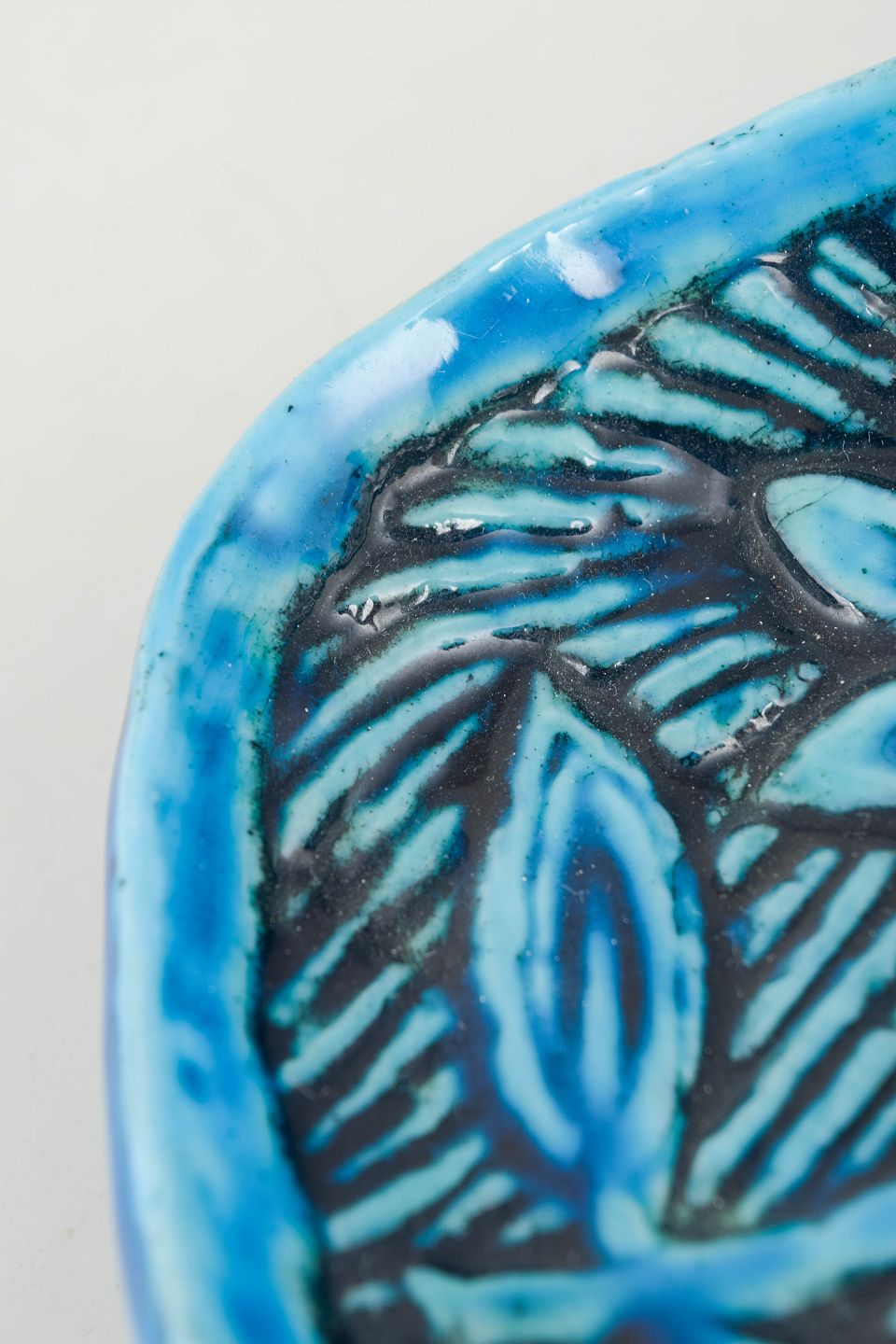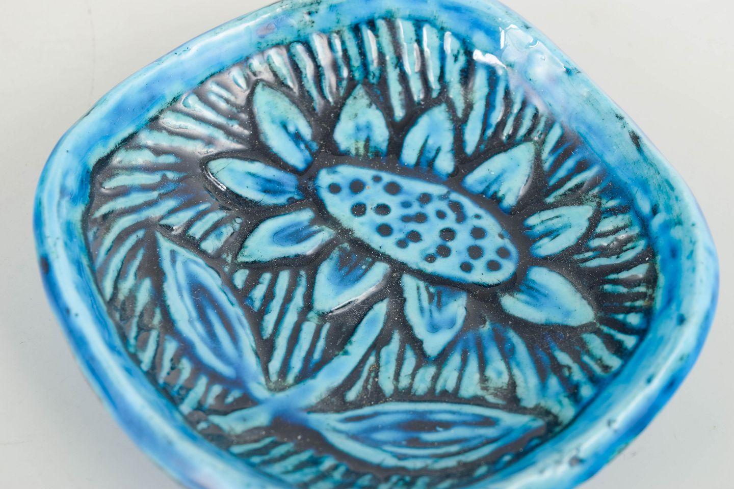 Hand-shaped ceramic dish with a vibrant turquoise-blue glaze and incised stylised floral decoration. A characteristic example of Nylund’s organic design language and colourful expression from the period.