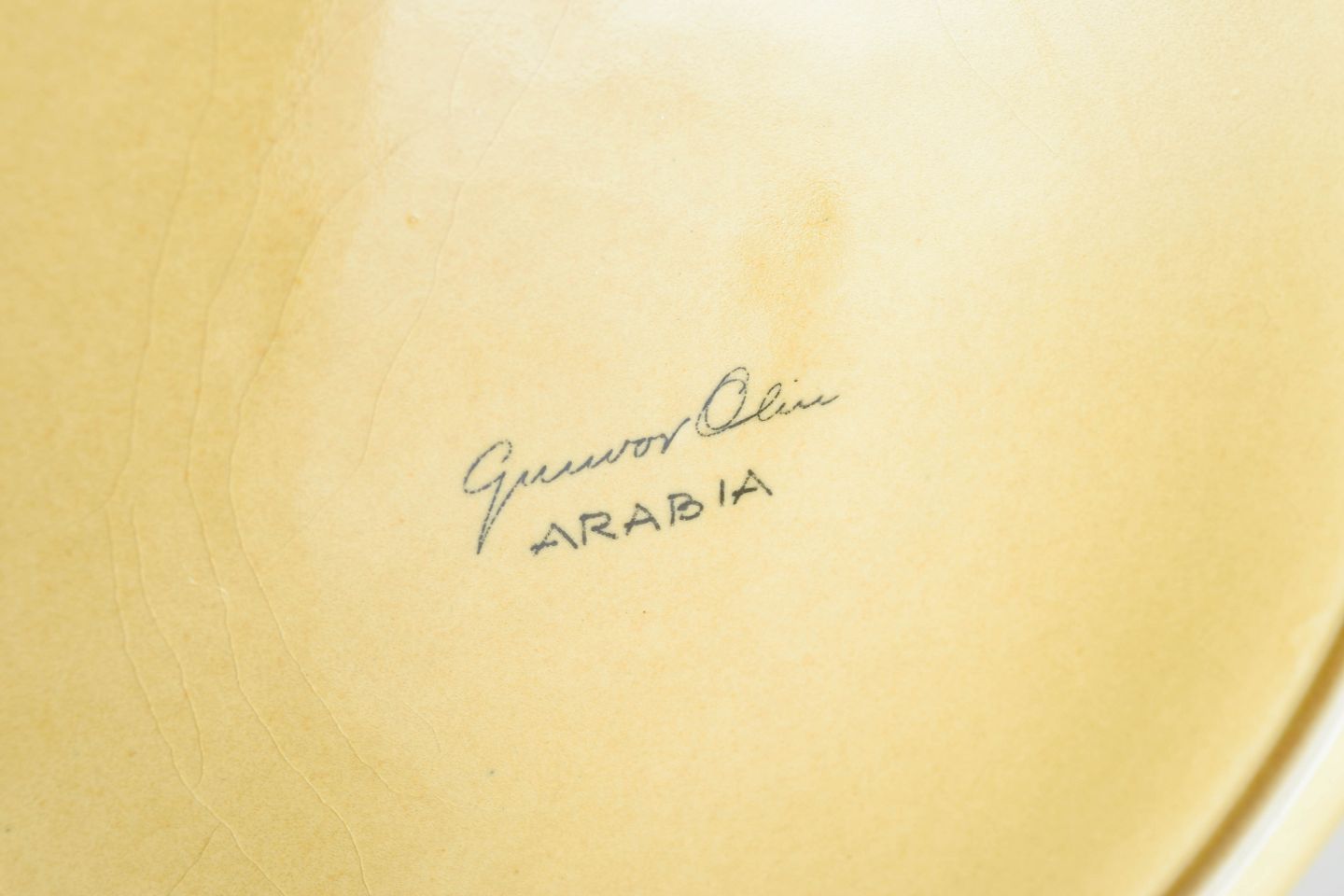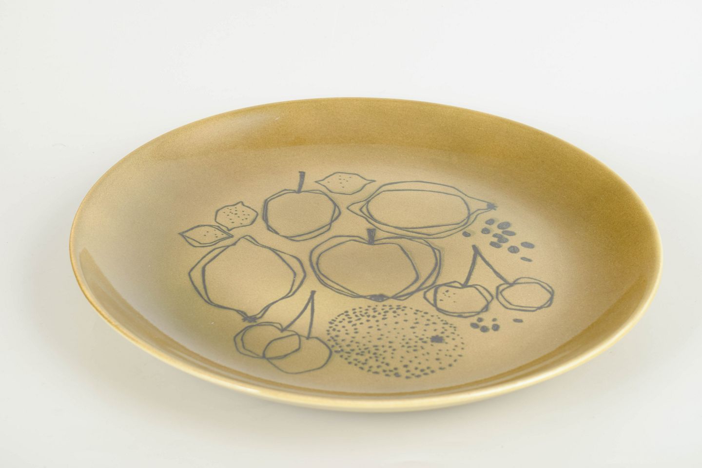 Ceramic dish with a graphic fruit motif in black on a mustard-yellow glaze – a characteristic example of Olin-Grönqvist’s playful line work and Arabia’s decorative design language of the era.