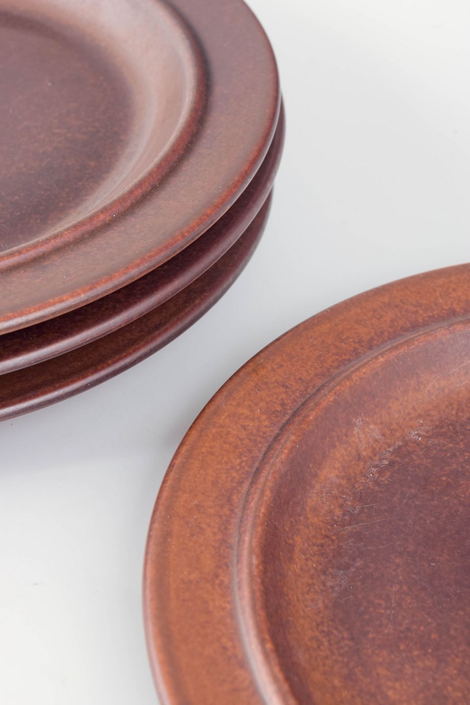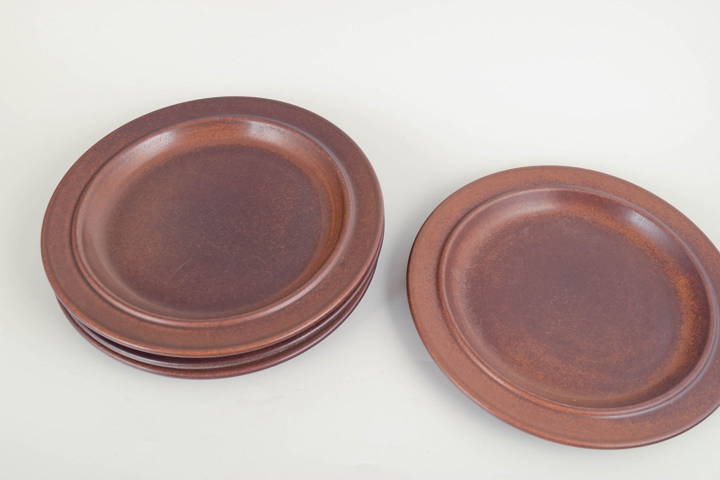 Four dinner plates in dark brown stoneware from Arabia’s iconic “Ruska” series, known for its durable chamotte body and the deep matte iron-brown glaze with natural variations.
