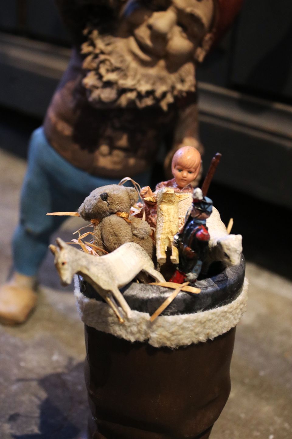 Old Christmas boot in painted papier-mâché, filled with old toys.