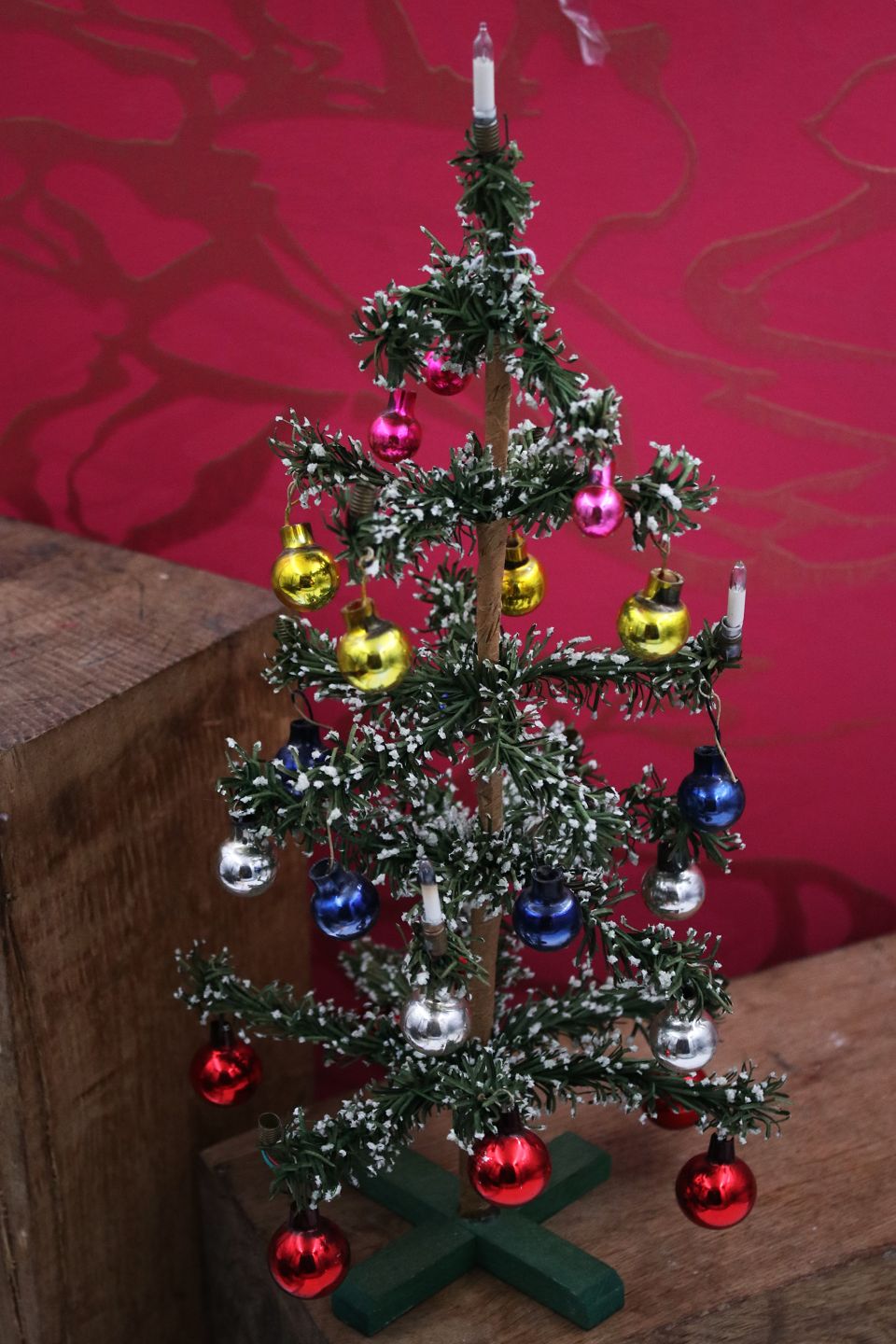 Antique miniature Christmas tree, decorated with lots of small colored Christmas glass balls...