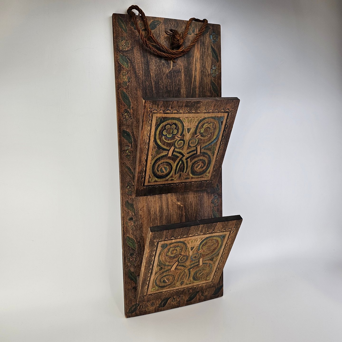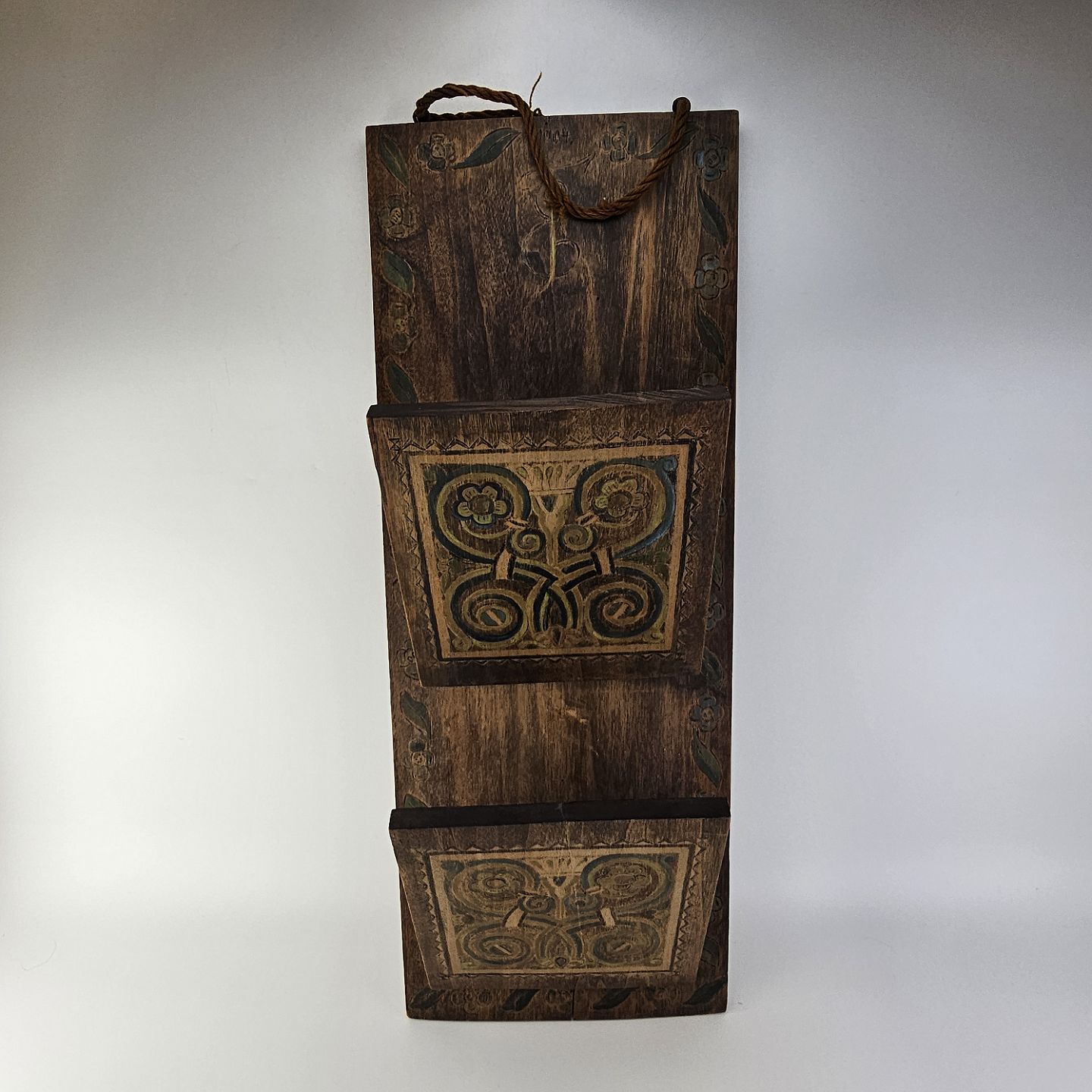 Nodeholder i træ med to låger, dekoration af malede blomster og reb til ophæng