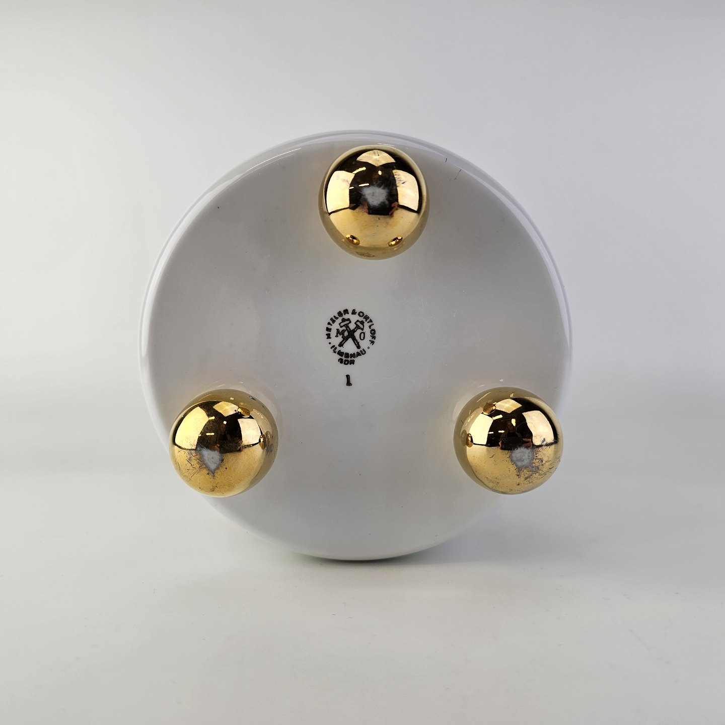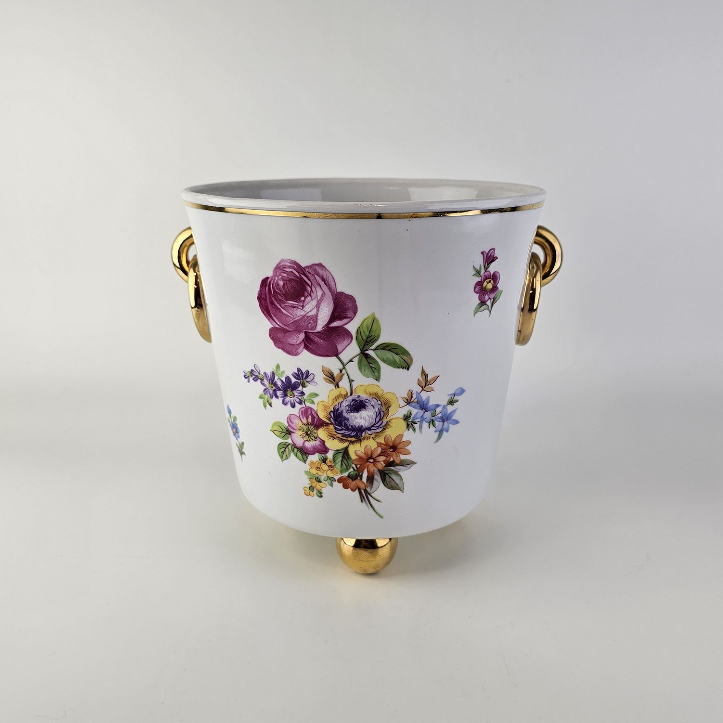 Urtepotteskjuler i porcelæn med farverigt blomstermotiv med tre guldbelagt kuglefødder og to guldbelagt hanke,