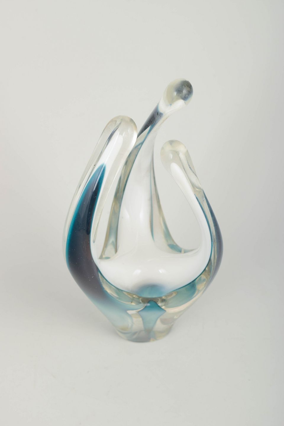 Sculptural, organically shaped art-glass vase in clear glass with layered turquoise, deep blue, and white tones. Mouth-blown with the characteristic upward sweeping arm/flame shapes from the early Coquille production. Elegant colour layering with a strong mid-century aesthetic.