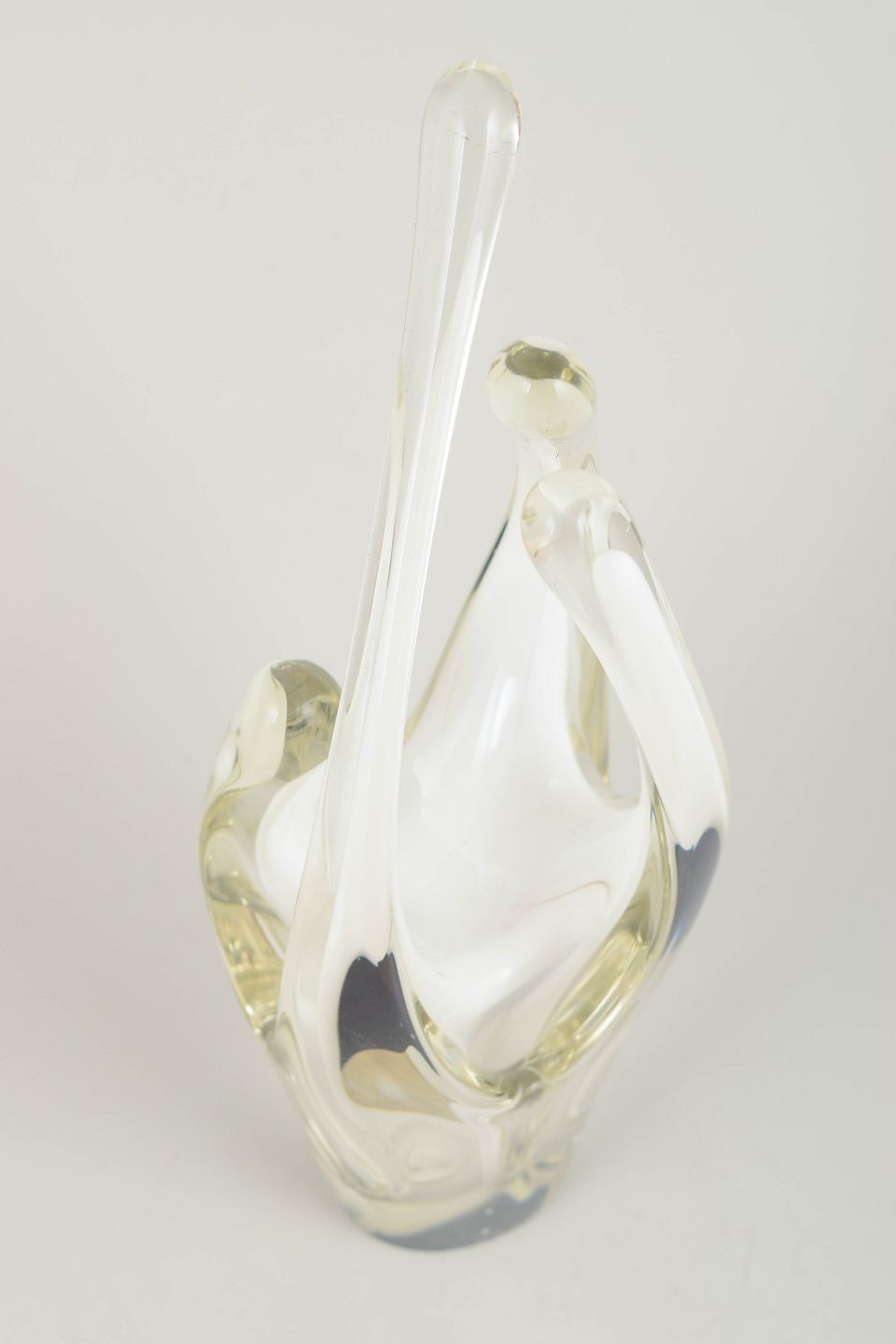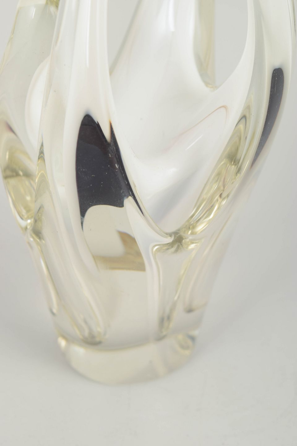 Organic, sculptural art-glass vase in clear glass with an inner white core, mouth-blown in the characteristic upward-flowing Coquille form. An elegant early example from the mid-1950s.