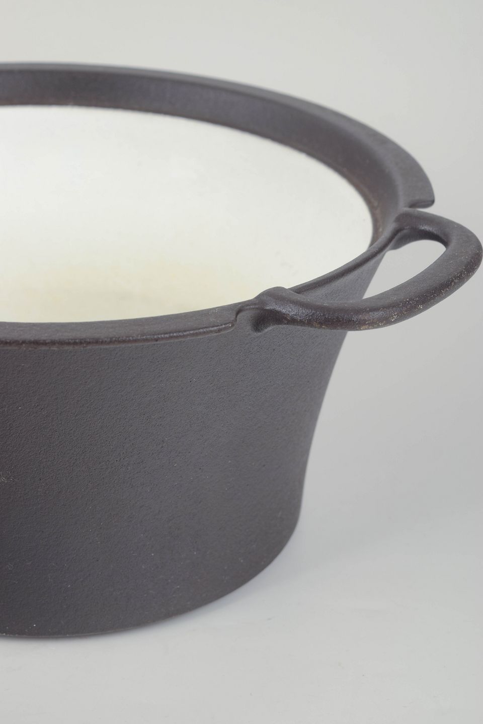 Classic cast-iron pot in matte black finish with enamelled interior and integrated handles. Heavy and robust construction, ideal for slow cooking and oven dishes.