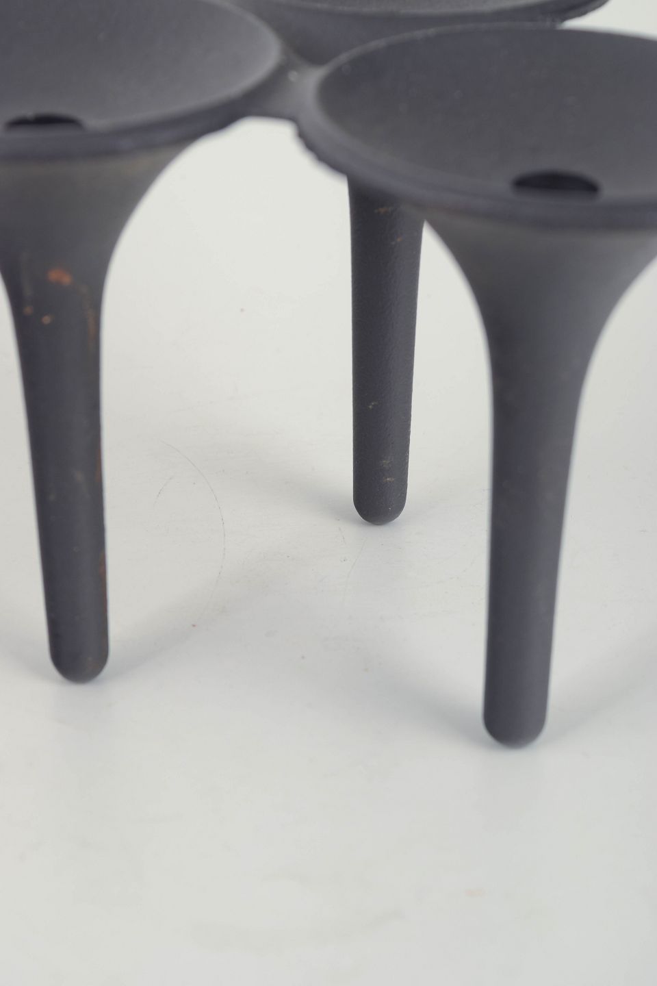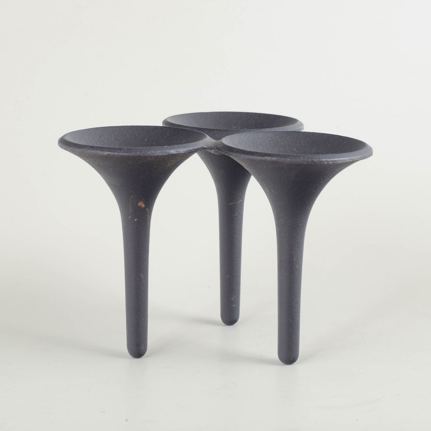 Sculptural, organically shaped candlestick in black-coated cast iron, executed in Quistgaard’s characteristic modernist idiom. The three tapered legs meet at a unified top with three shallow bowl-shaped holders.