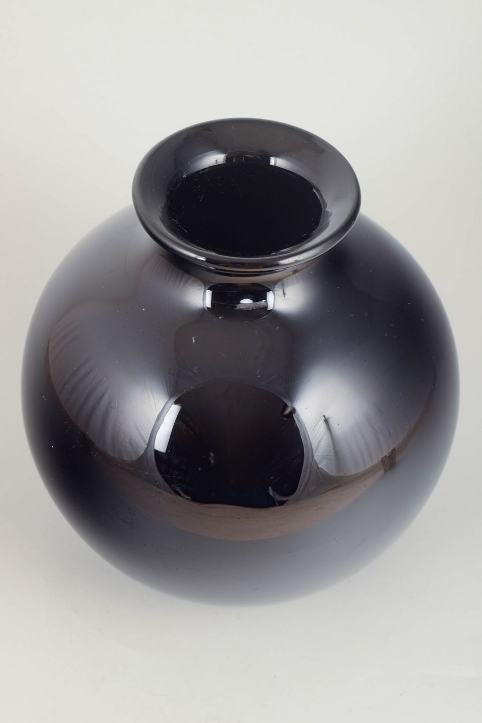 Mouth-blown Art Deco glass vase in a deep, near-black tone with a rounded body and gently flared rim. Unsigned, as is common for the period and for many of Notini’s works for Pukeberg.