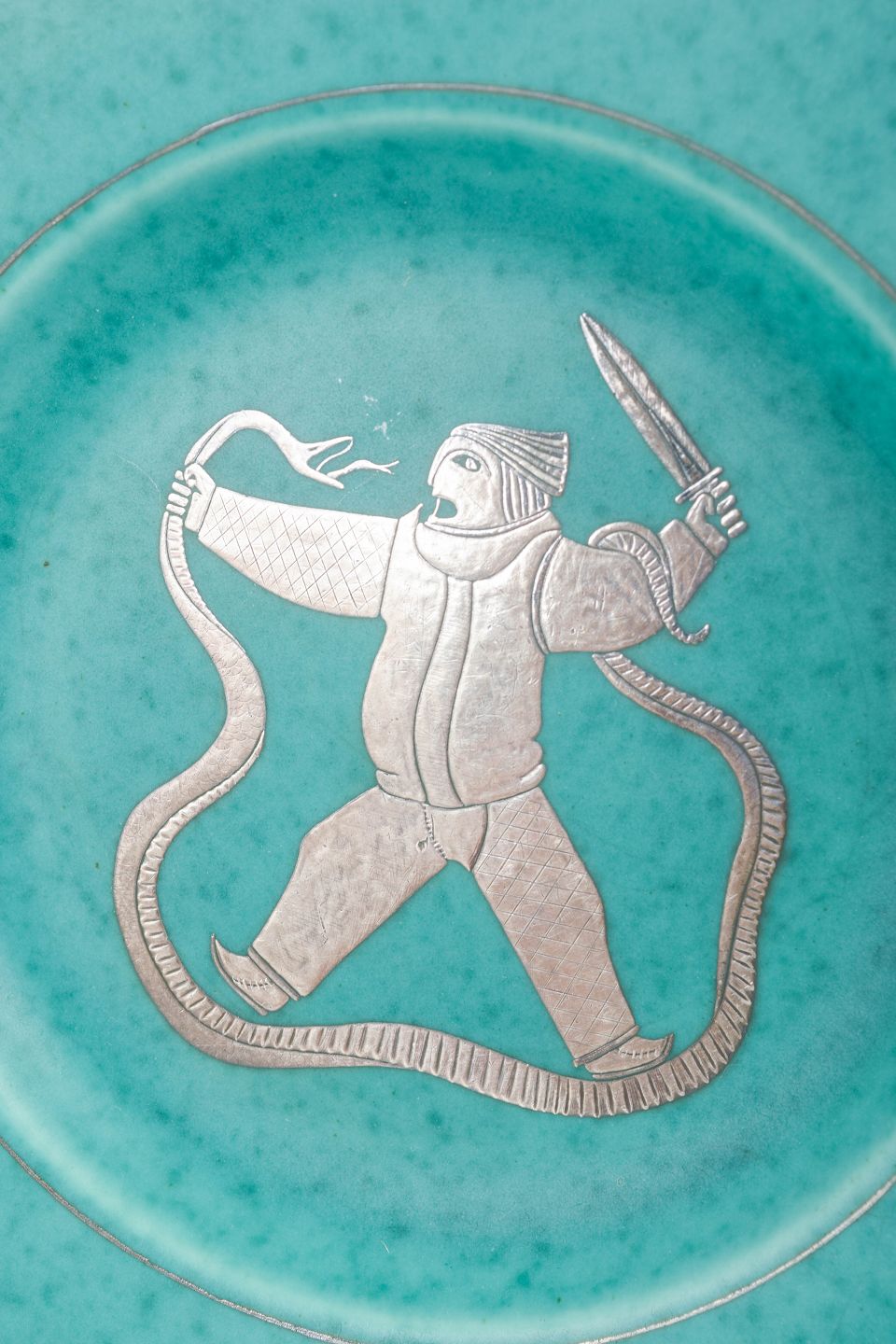 Large decorative dish in the iconic turquoise Argenta glaze with silver inlay. The centre features a mythological figure rendered in Kåge’s characteristic linework, surrounded by a silver-inlaid braided border. A striking and less common Argenta piece in a substantial format.