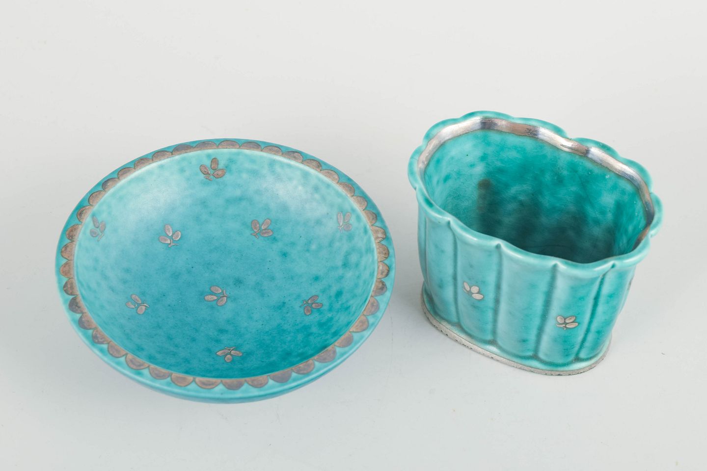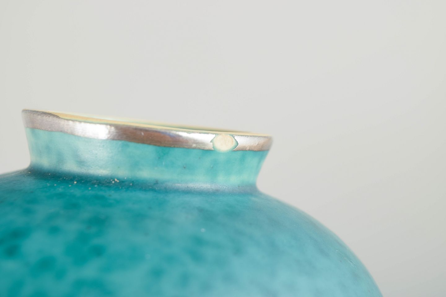 Bowl and small vase in the classic turquoise glaze with silver inlays, characteristic of Kåge’s iconic Argenta work for Gustavsberg. Elegant small formats with clear studio craftsmanship.