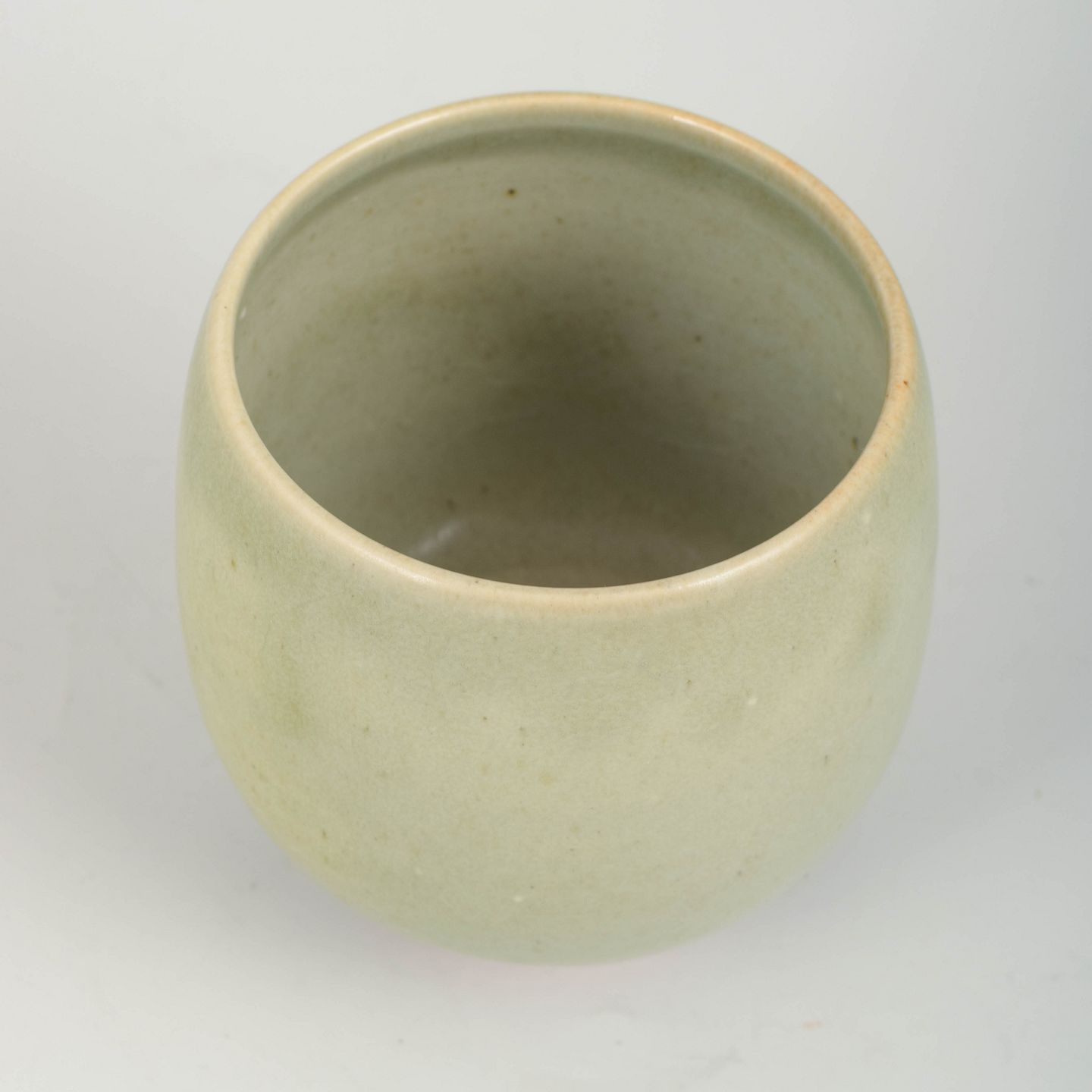 Beautiful hand-thrown unique stoneware vase with a softly rounded form, finished in a subdued, green-tinged celadon glaze with a smooth, even surface. The warm terracotta tone at the foot creates a subtle contrast, characteristic of Palm’s simple and material-focused expression. An elegant example of his more minimal studio work from the period.