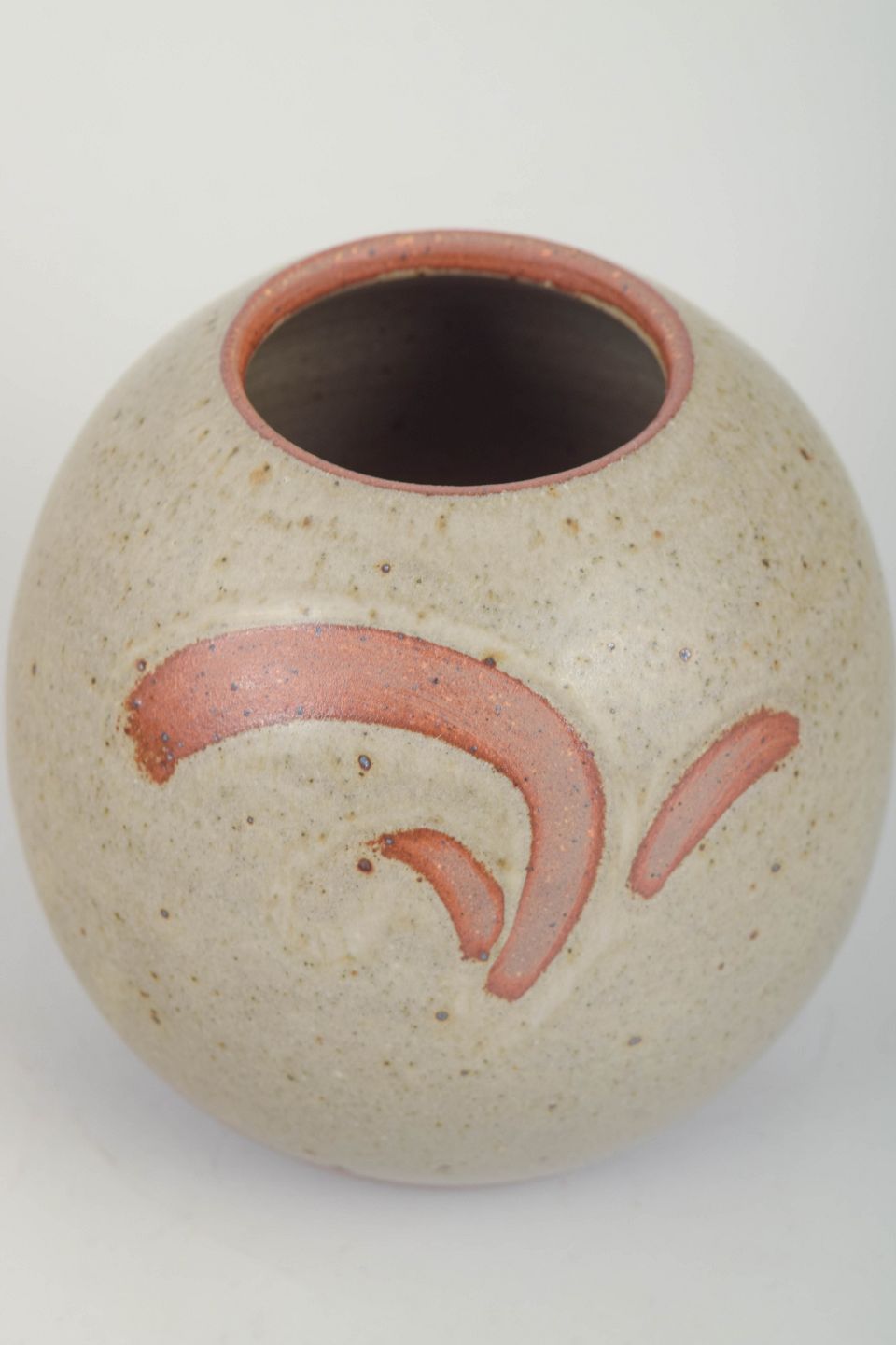 Hand-thrown stoneware vase with a rounded, organic form. Executed in Palm’s characteristic tactile style with a two-tone matte glaze: the upper section in a pale chalk-like shade and the lower section in muted rose. A refined and balanced example of Palm’s more minimalist studio work.