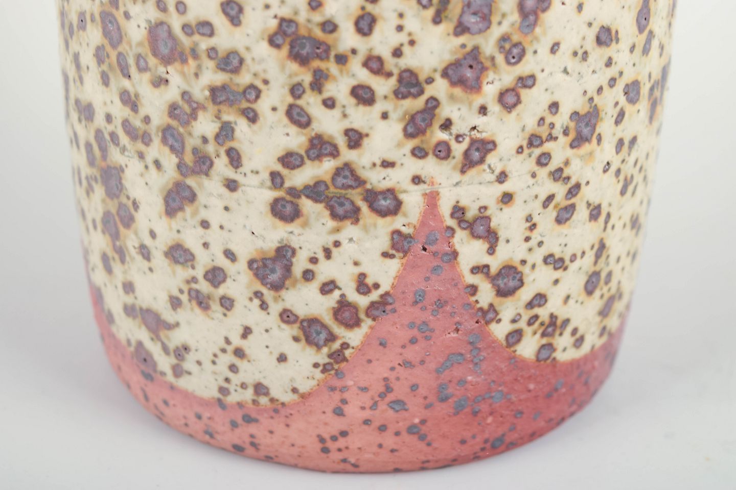 Impressive hand-thrown stoneware vase by Rolf Palm, produced in his studio in Mölle. Cylindrical shape with a slightly tapered neck and a distinctive, heavily textured surface. The glaze is typical of Palm: a volcanic, tactile expression in cream, red and brown tones.