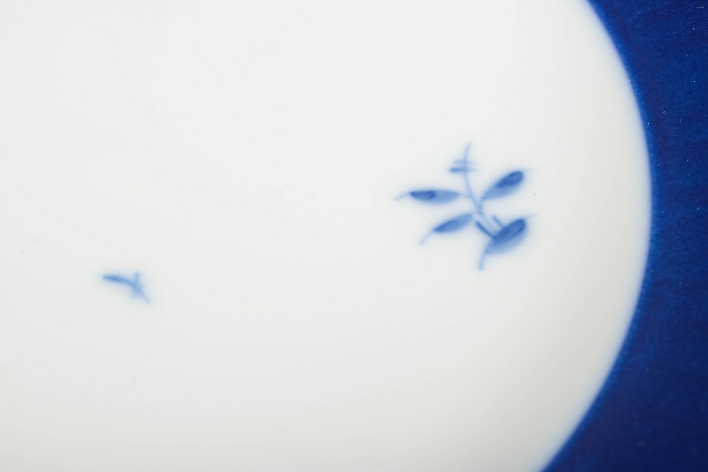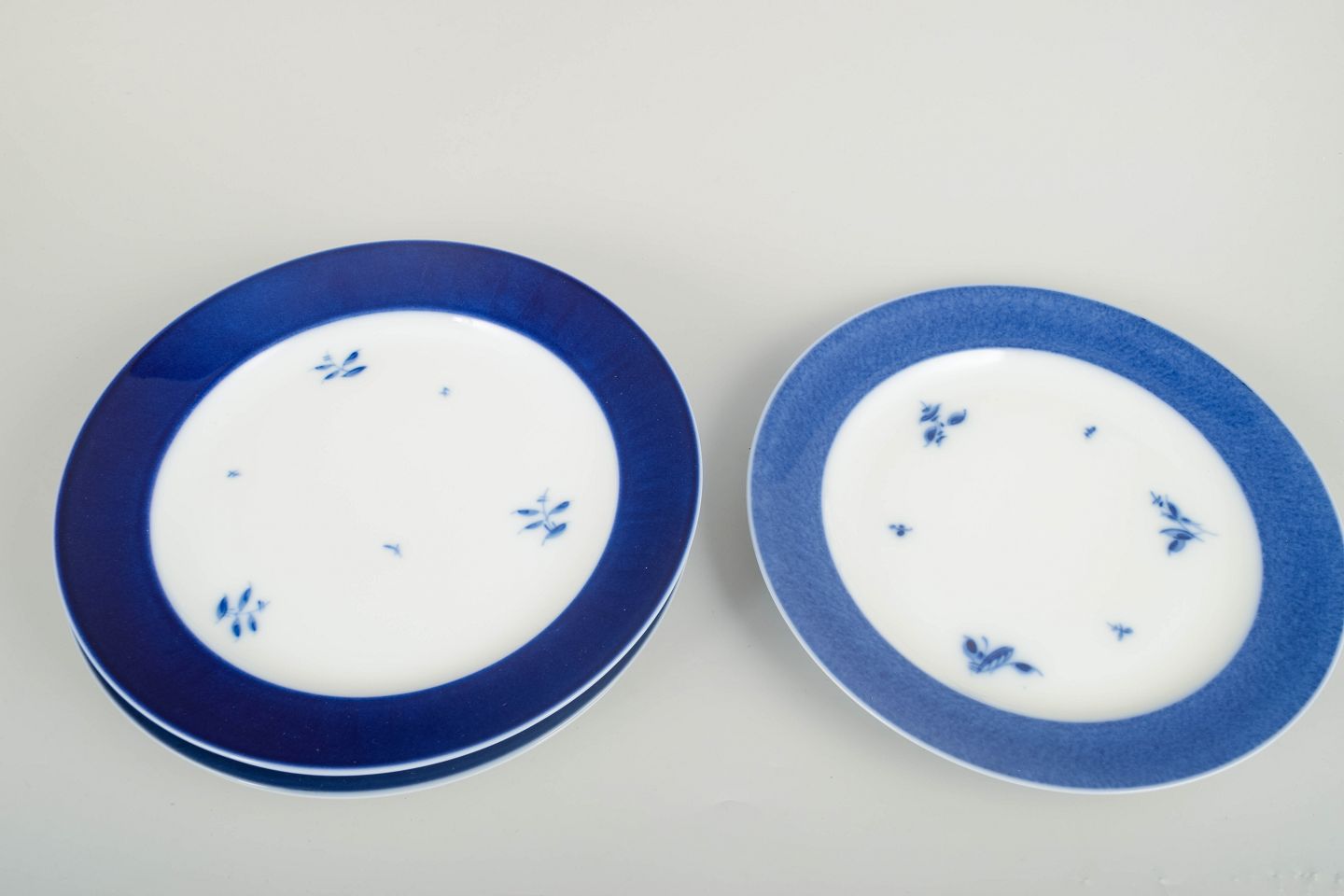 Rare large porcelain plates featuring a deep blue rim and hand-painted floral accents in classic Royal Copenhagen style. An elegant and timeless 1950s design, sought after for its clean aesthetic and harmonious colour palette.