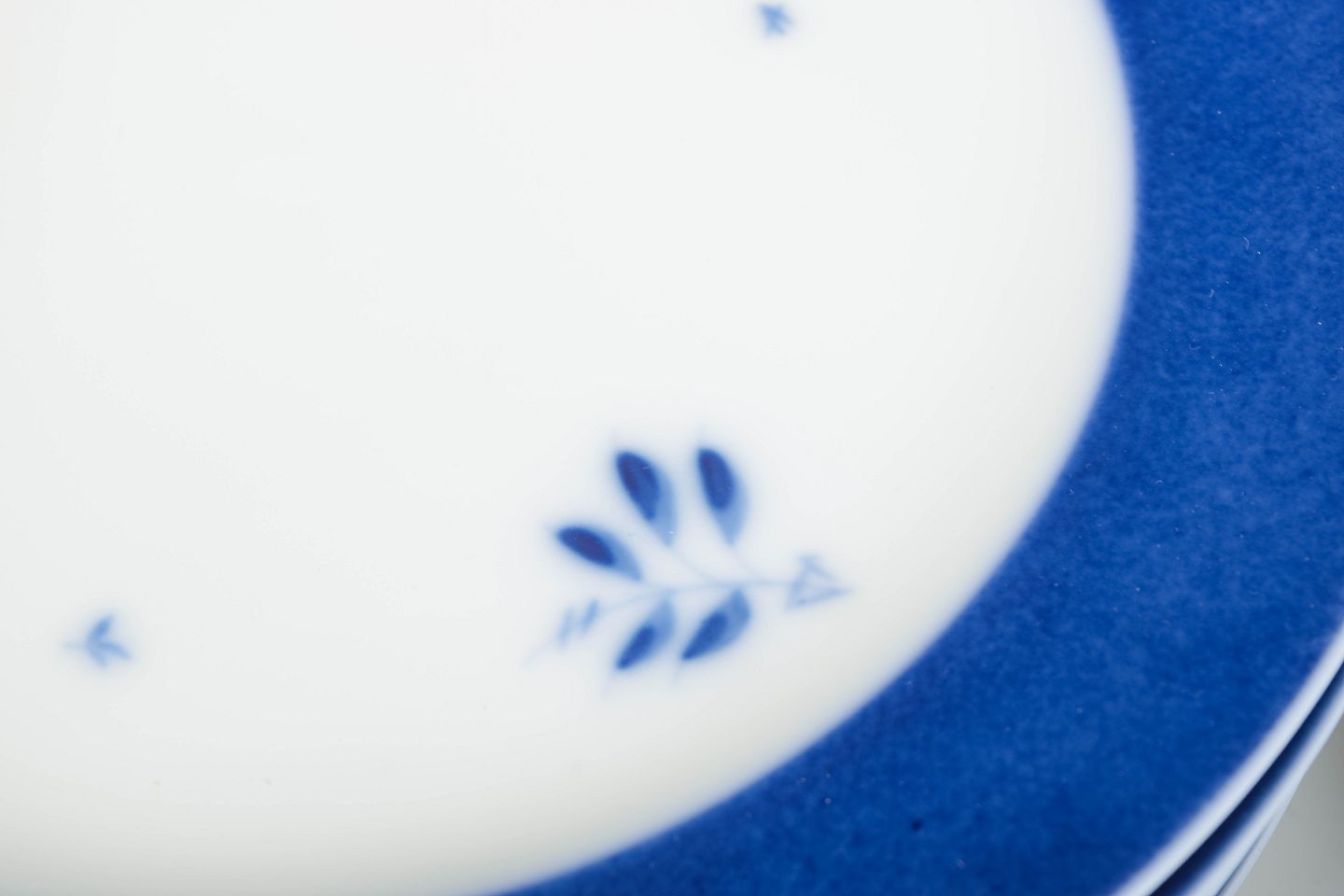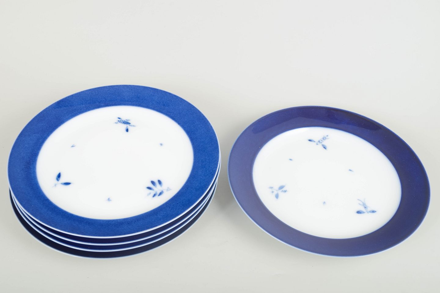 Rare large porcelain plates featuring a deep blue rim and hand-painted floral accents in classic Royal Copenhagen style. An elegant and timeless 1960s design, sought after for its clean aesthetic and harmonious colour palette.
