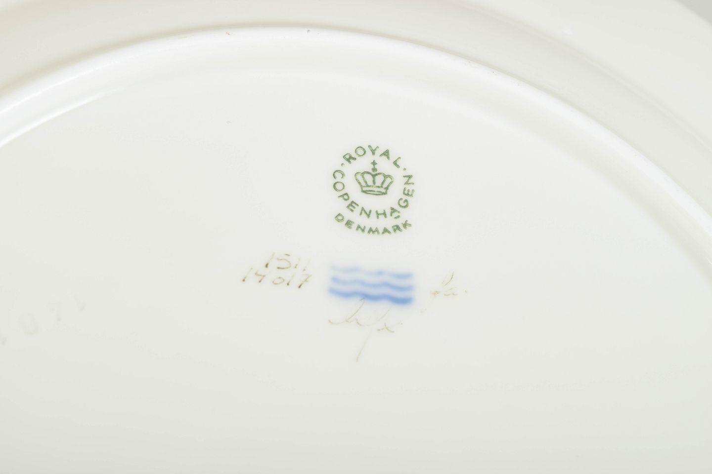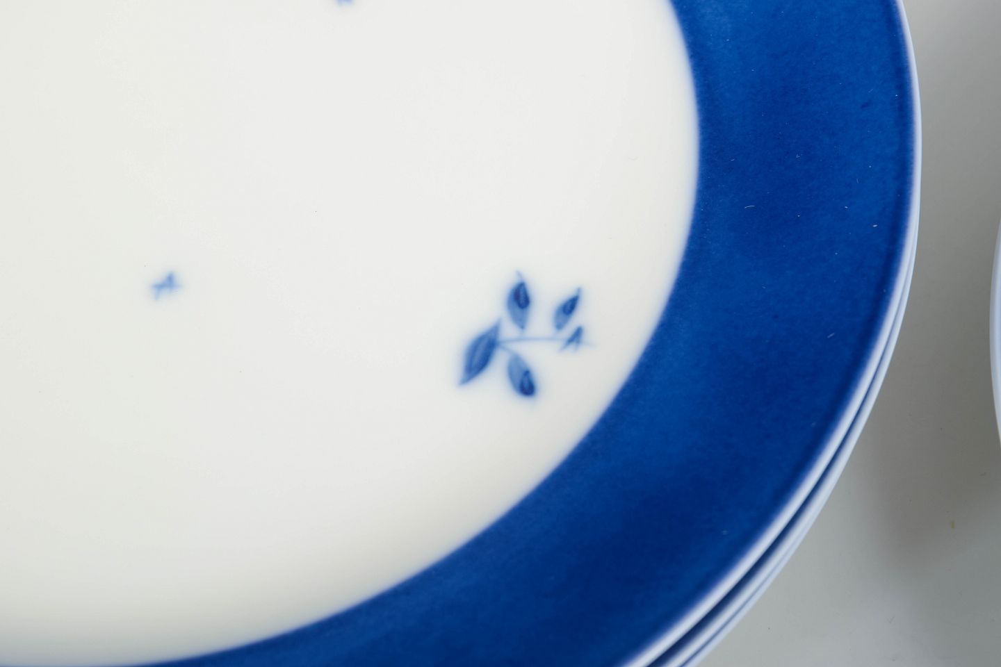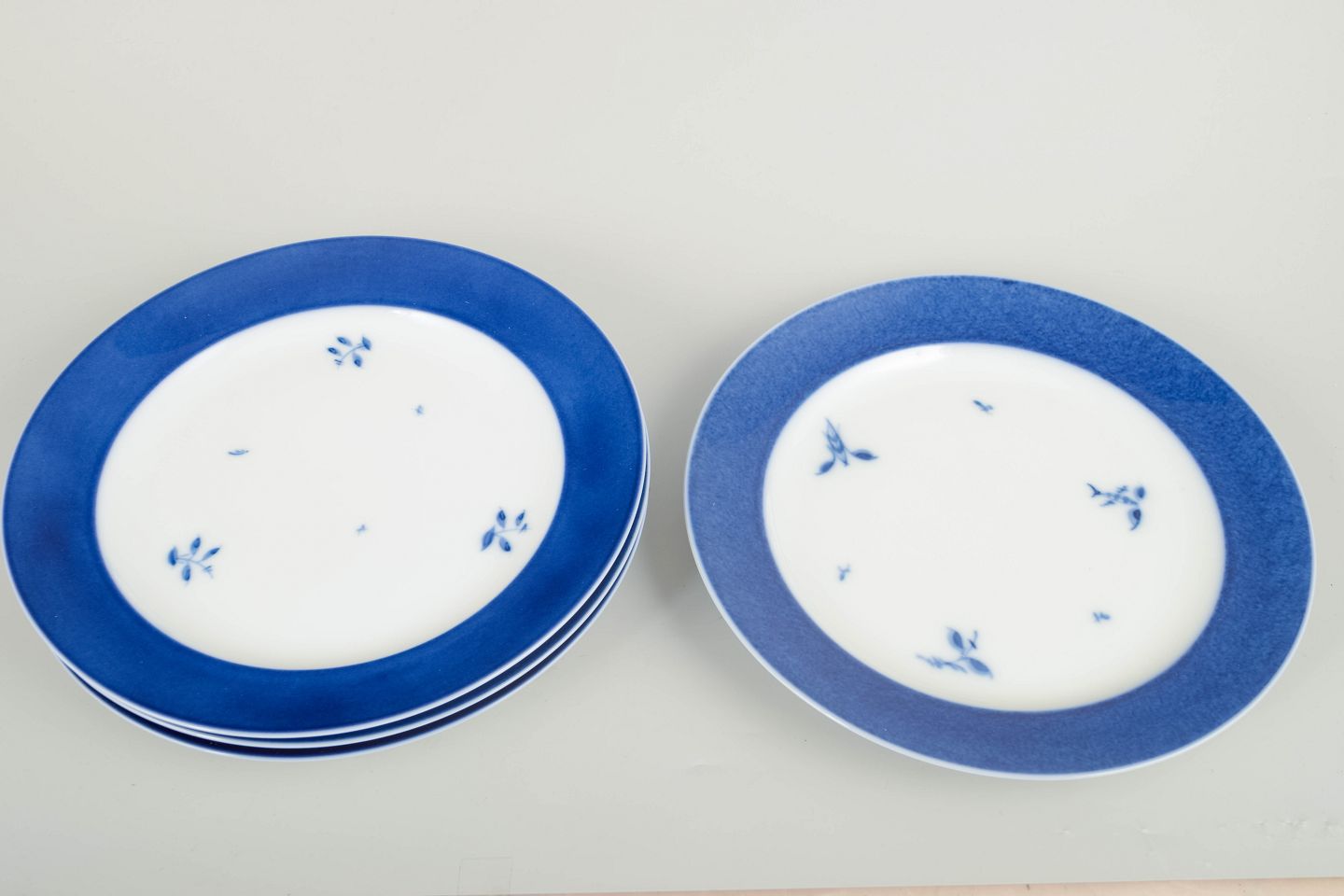 Rare large porcelain plates with a wide blue rim and delicate hand-painted floral motifs. A classic Royal Copenhagen aesthetic expressed in a clean and elegant 1960s design.