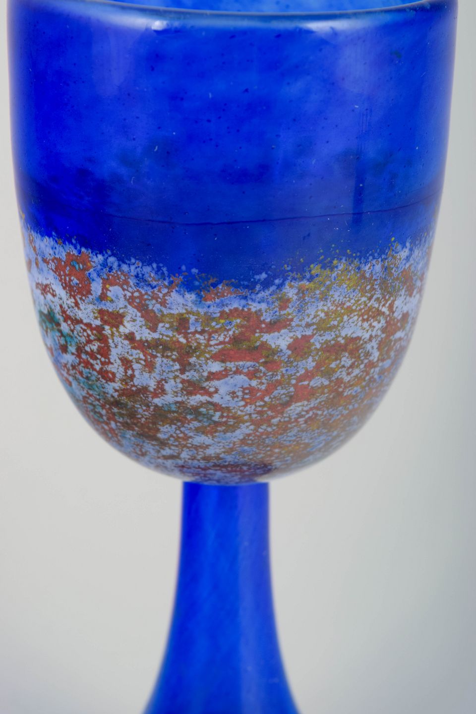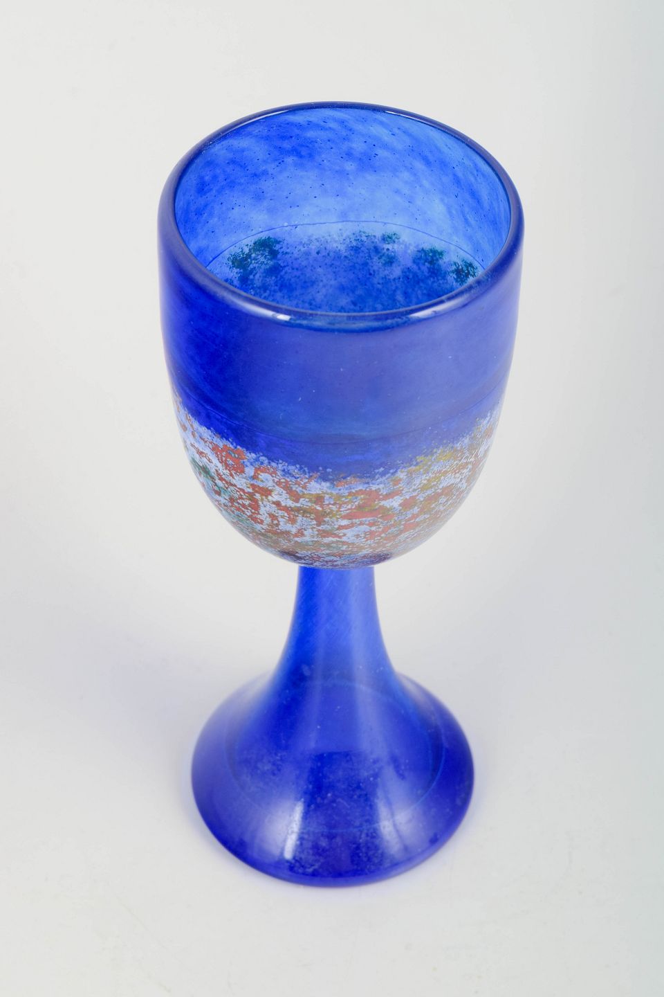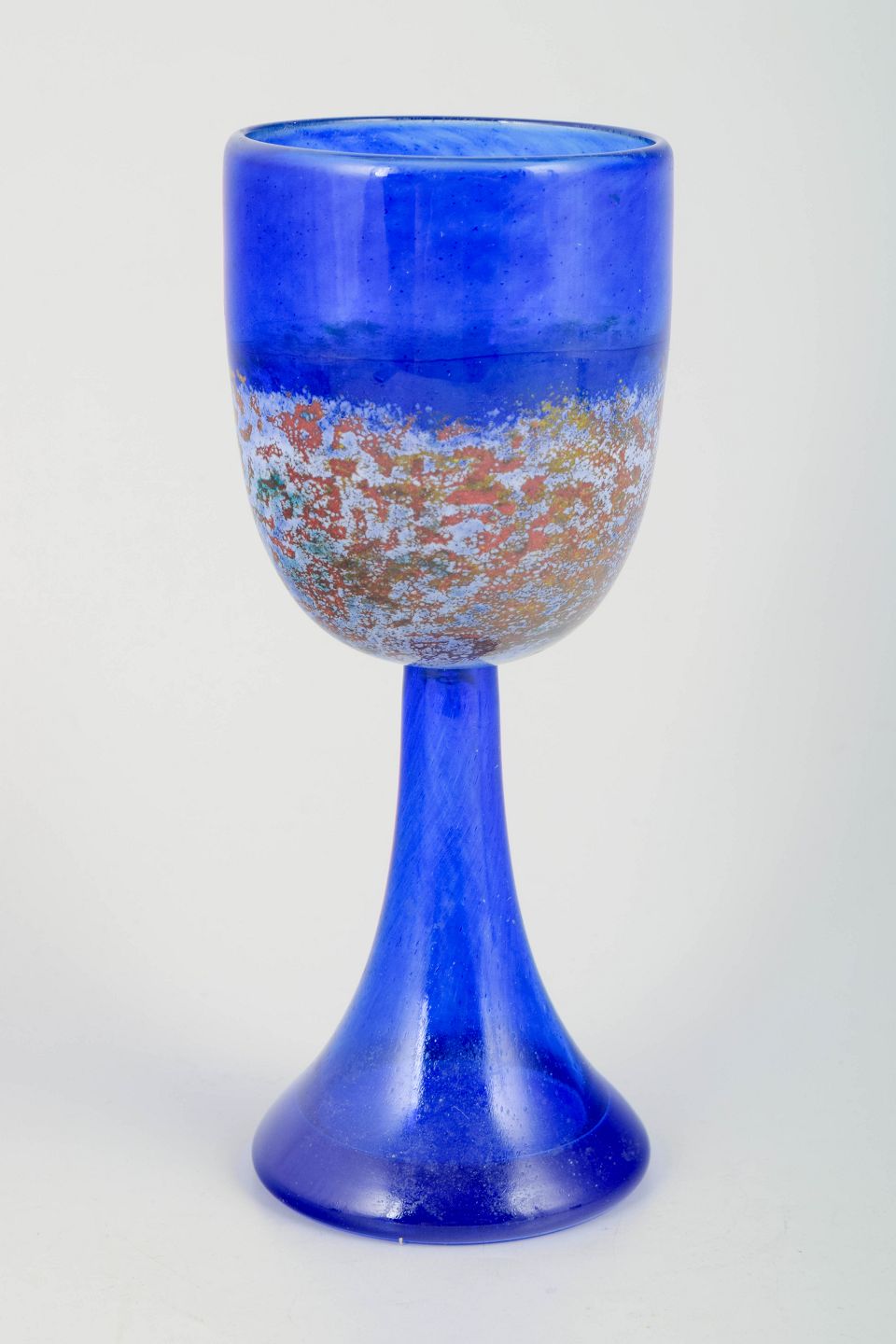 Signed art glass goblet in intense cobalt blue with a decorative band of multicoloured fused particles. Sculptural foot and classic chalice form, characteristic of Engmann’s vibrant and narrative visual language.