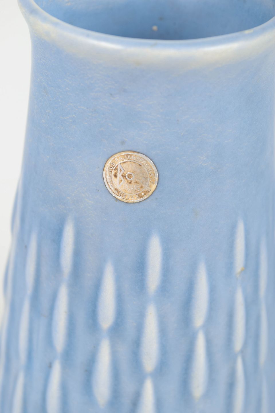 Handmade faience vase in light blue glaze with relief decoration and original Bo Fajans label preserved. Model D382. Refined cylindrical form featuring organic, droplet-inspired vertical patterns.