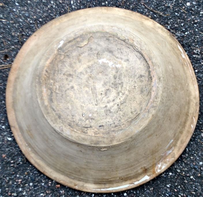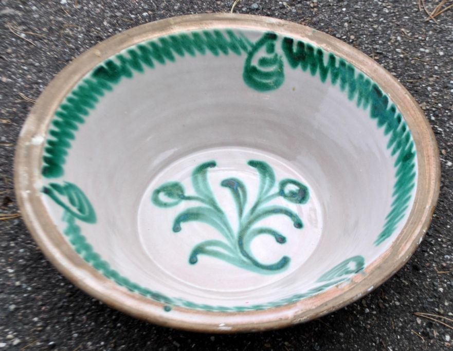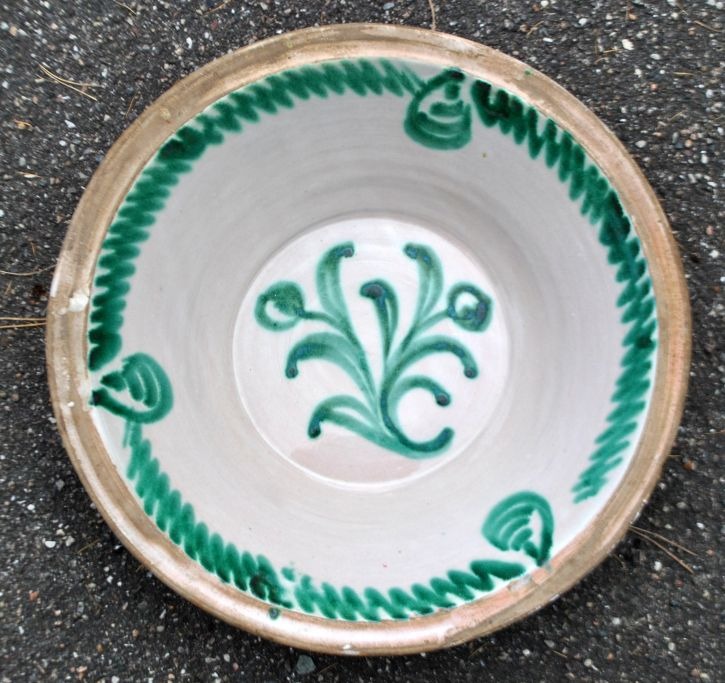 Large antique clay dish, 19th century. Inside with green and light glazes. With edge decoration and center decoration in the shape of a flower. Dia.: 42 cm. H.: 12 cm.