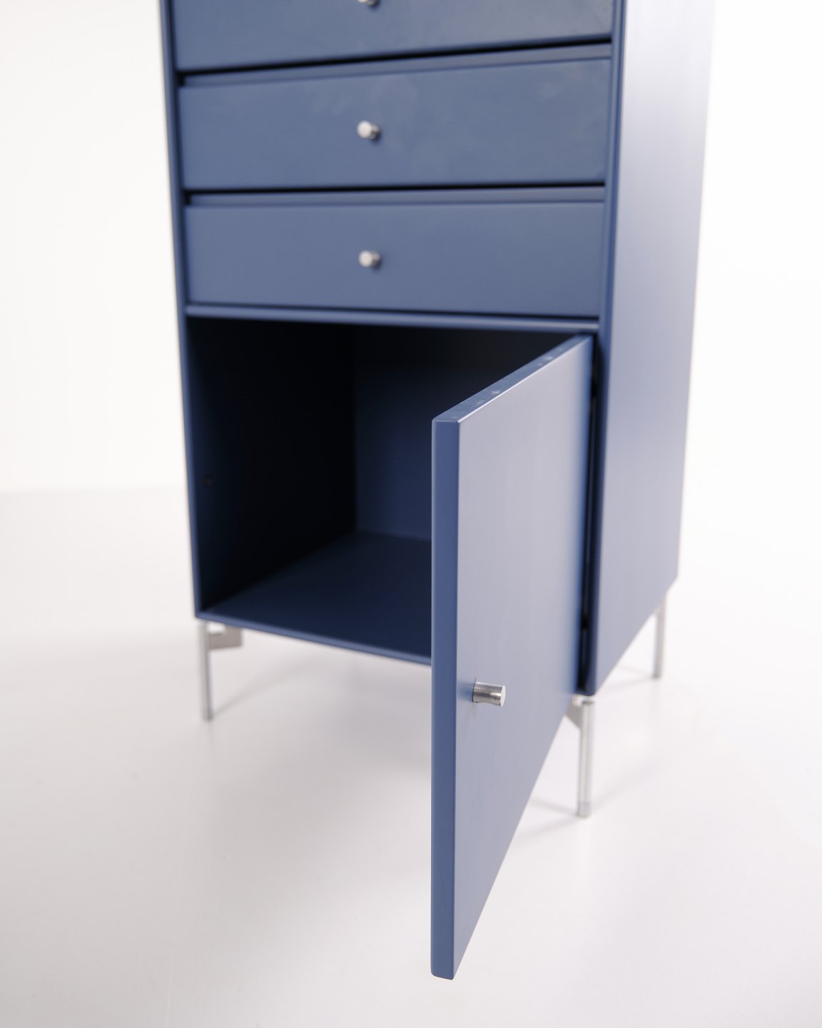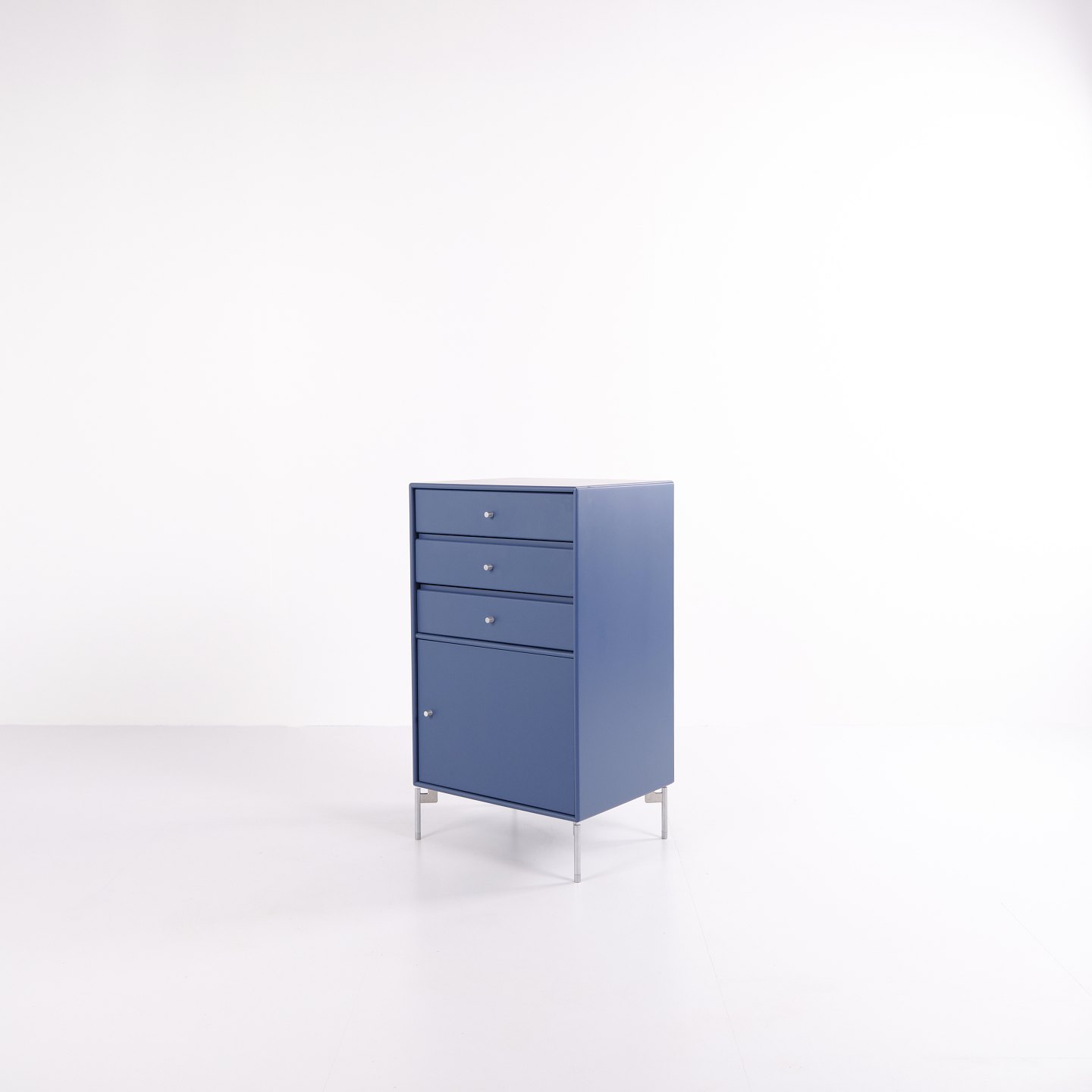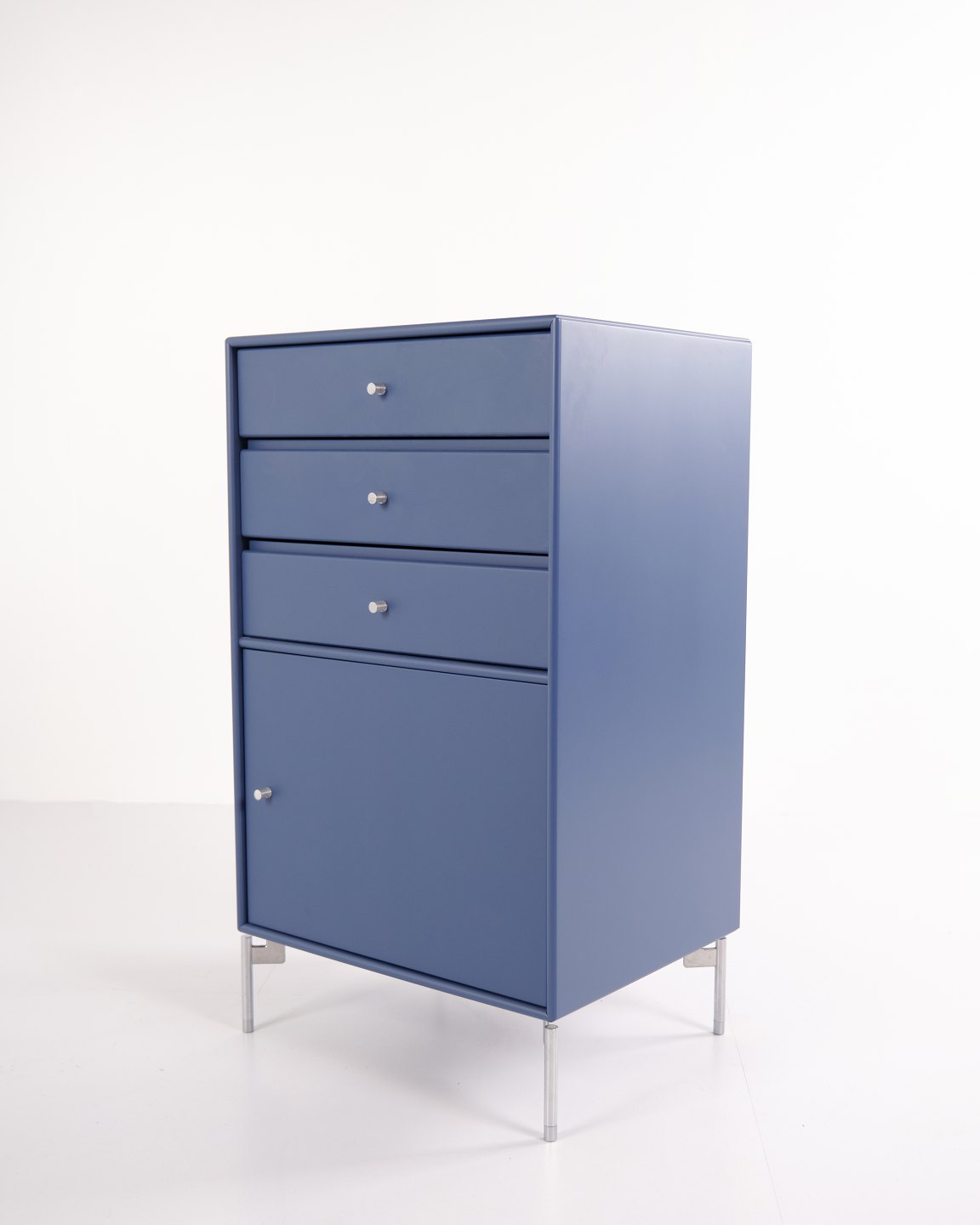 Montana cabinet / filing cabinet in blue, fitted with chrome legs. Features three drawers and one door, ideal for storage in an office, living room or hallway. Classic Montana module with high functionality and timeless design.