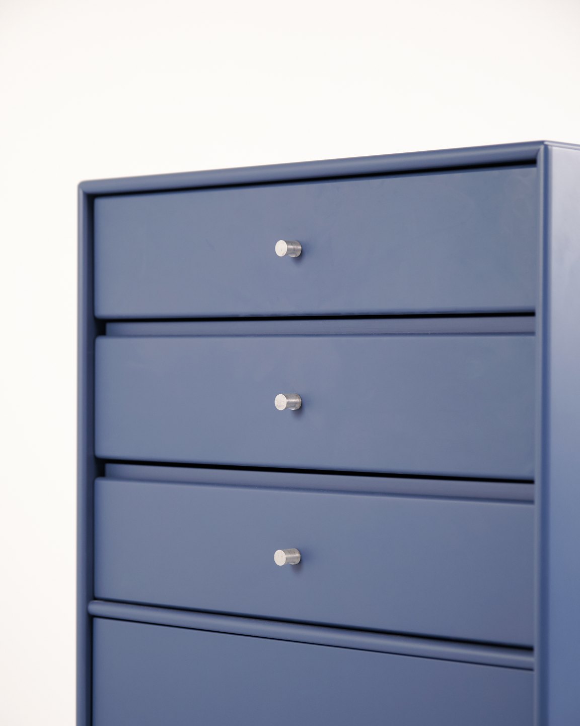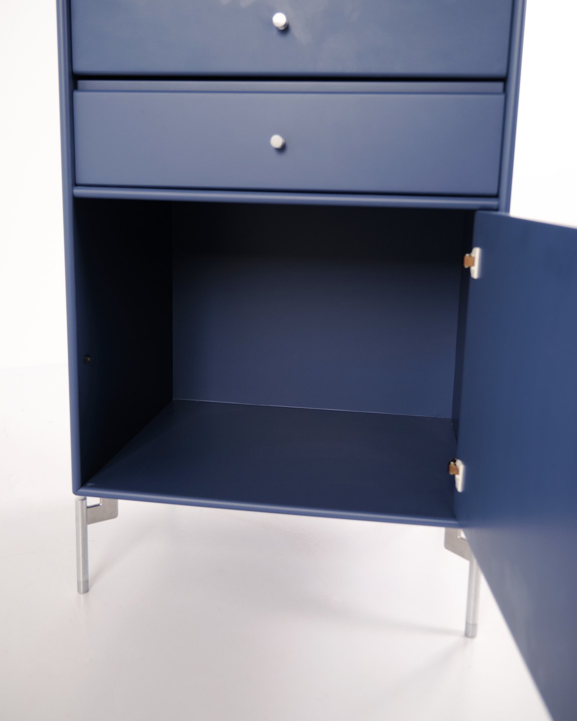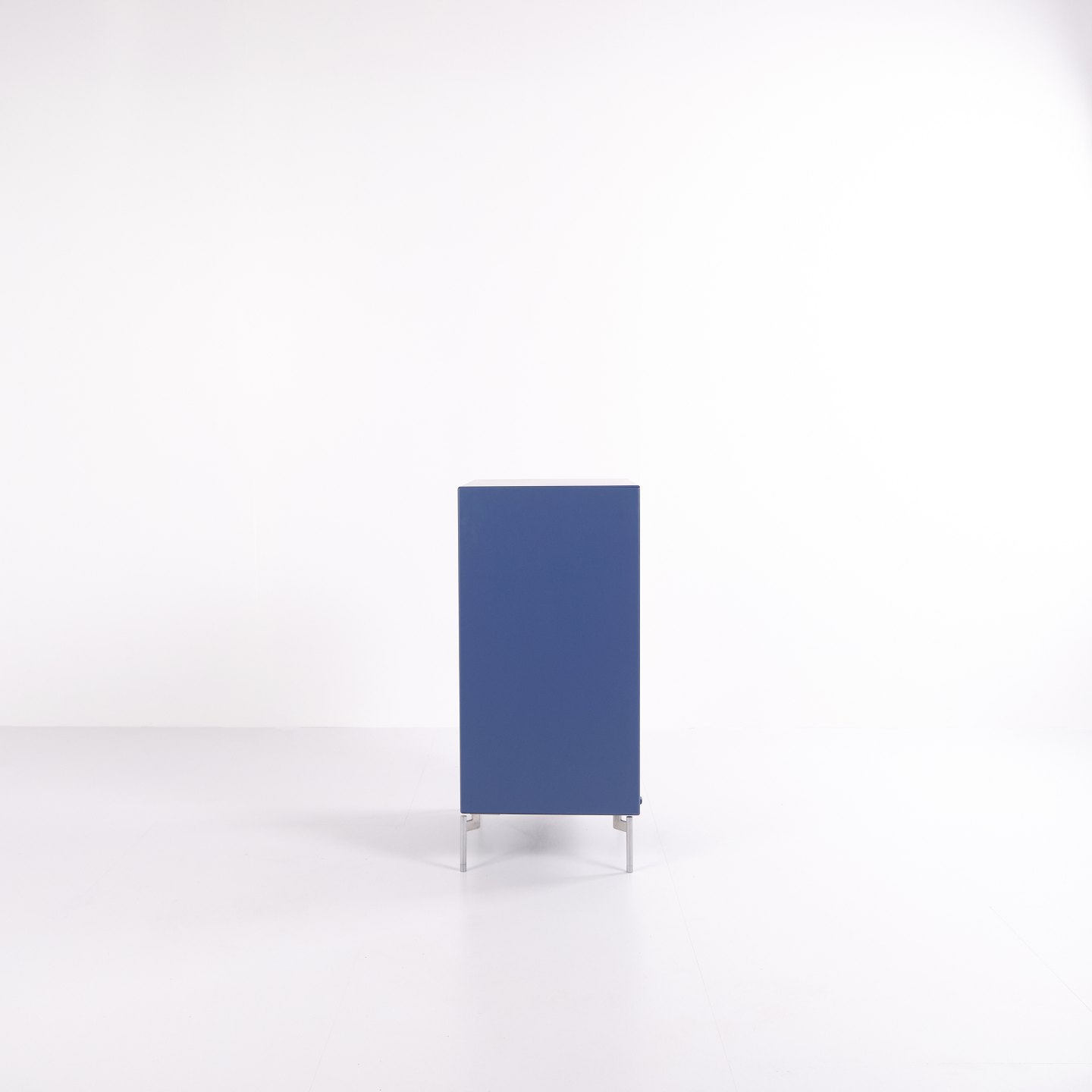 Montana cabinet / filing cabinet in blue, fitted with chrome legs. Features three drawers and one door, ideal for storage in an office, living room or hallway. Classic Montana module with high functionality and timeless design.