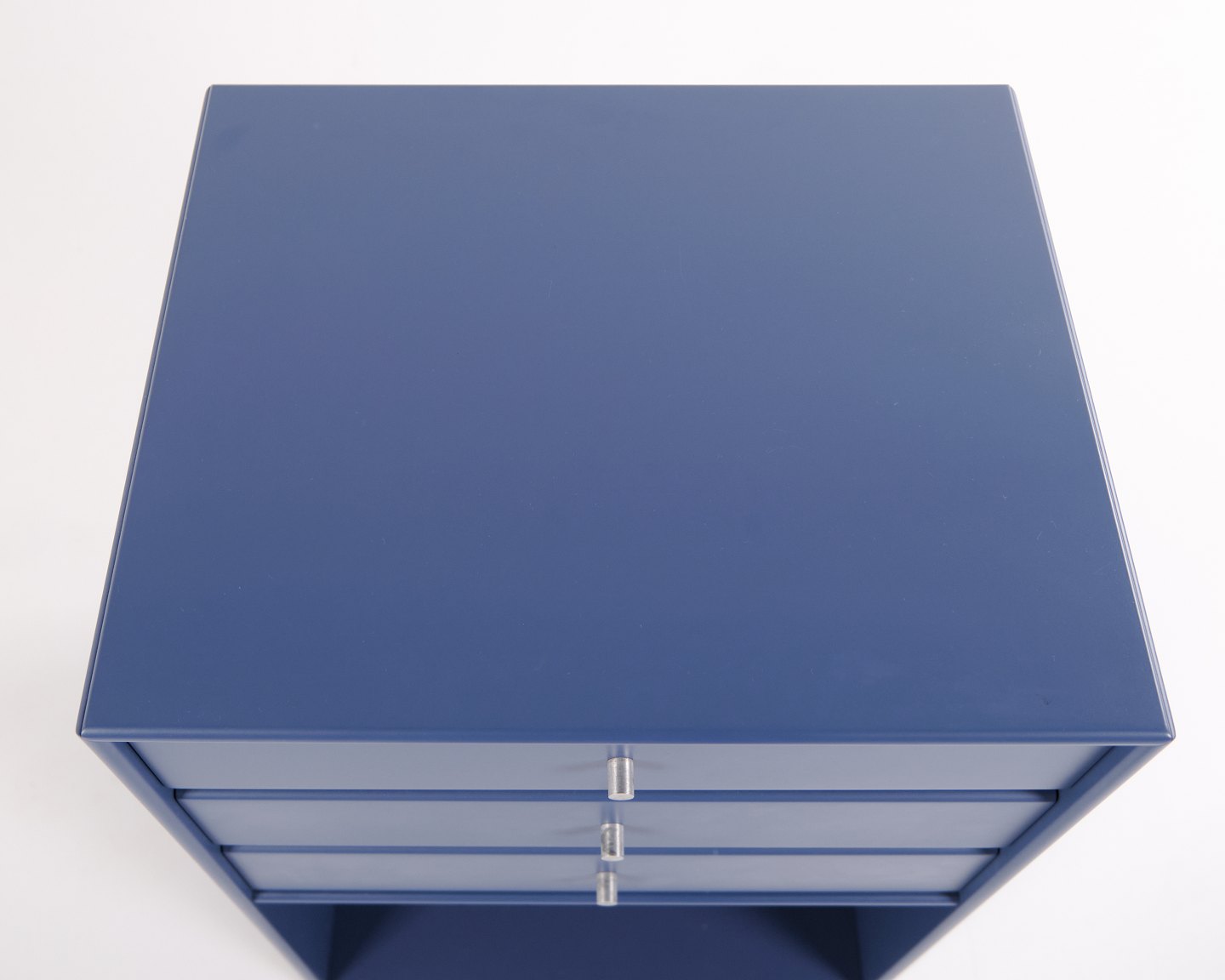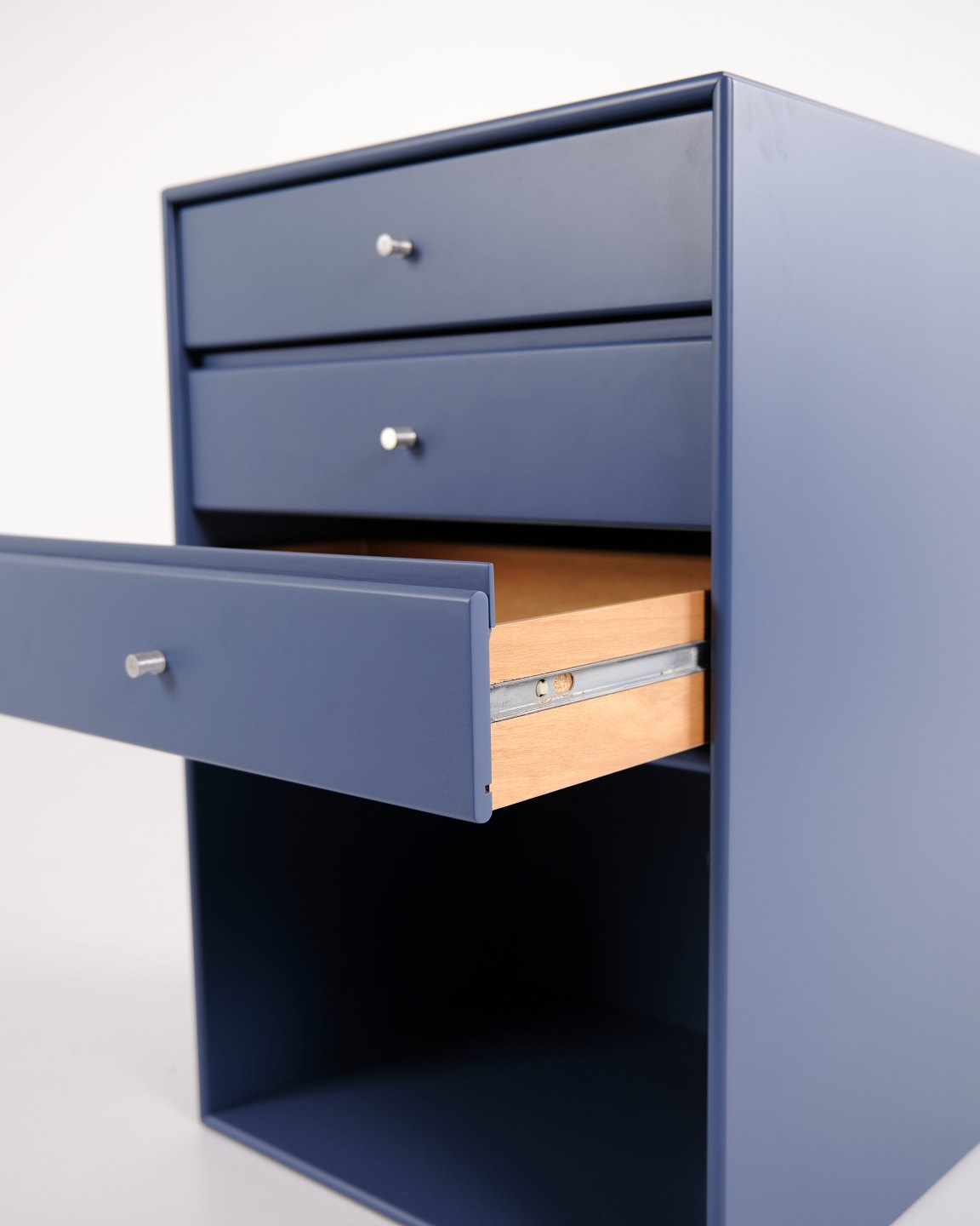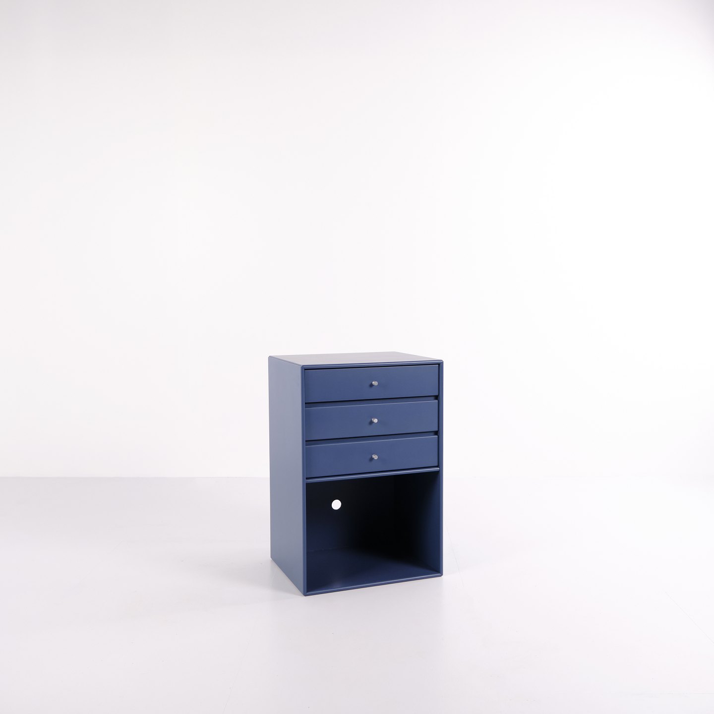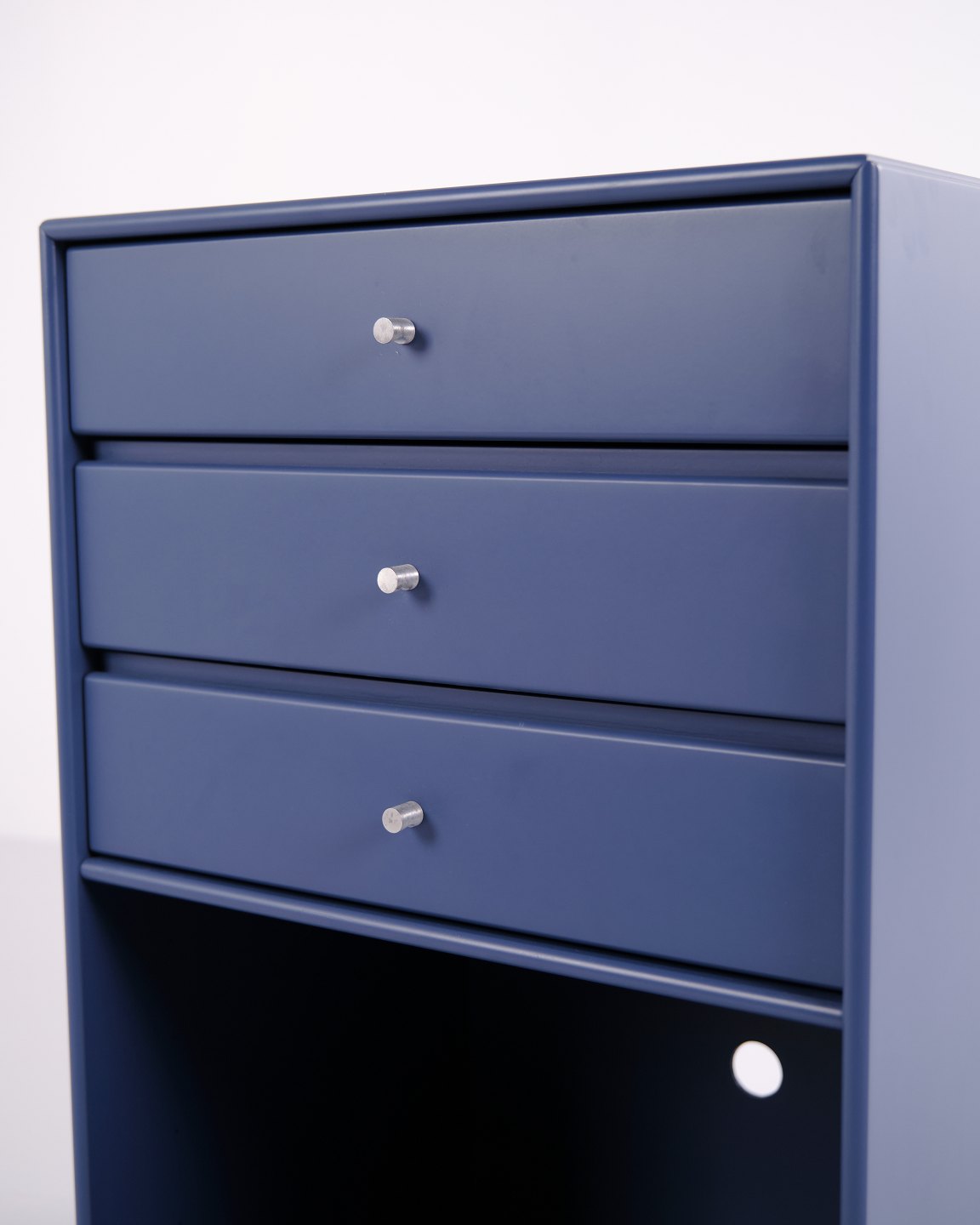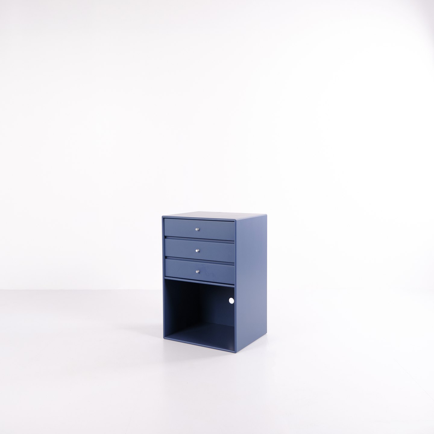 Montana shelf unit in blue with chrome legs. Designed with three drawers and one open shelf, suitable for both storage and display. A classic Montana module combining functionality with a clean, simple design.