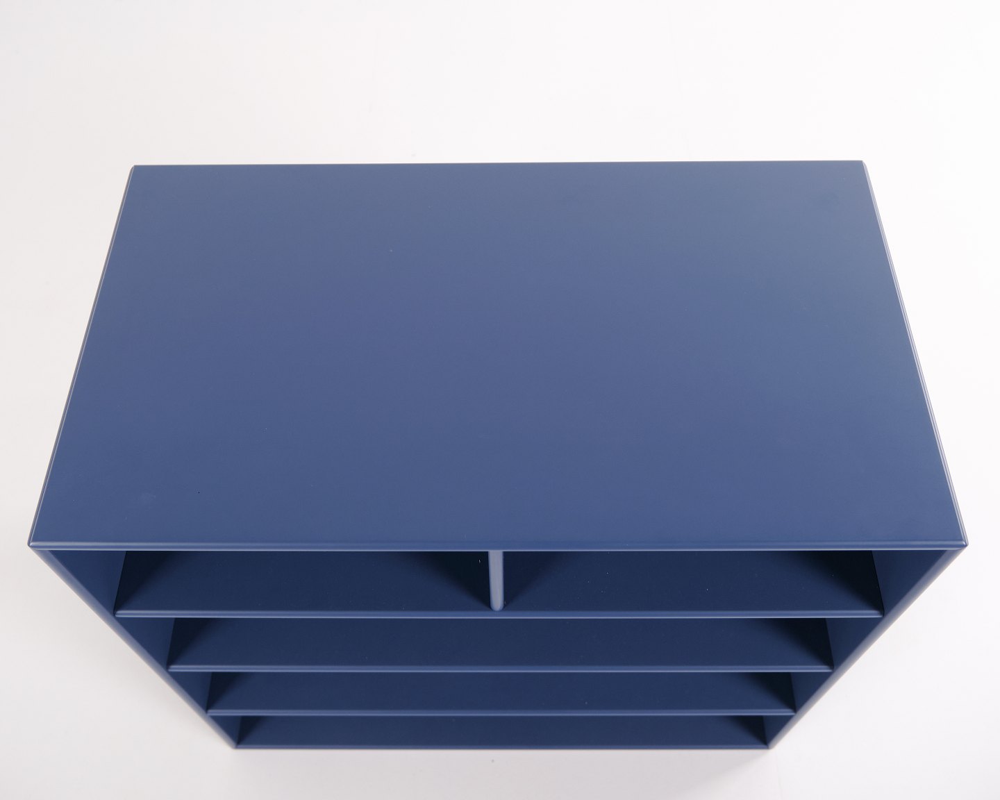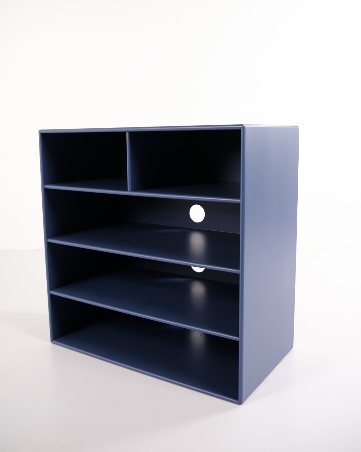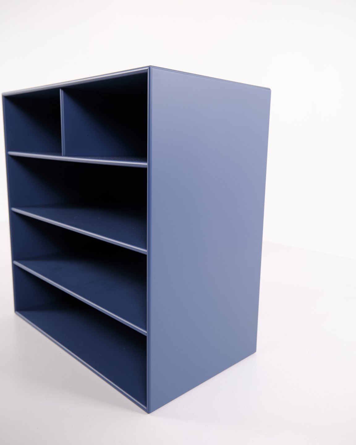 Montana shelf unit in blue with chrome legs. Designed with four open shelves, ideal for storage or display in a living room, office or hallway. A classic Montana module with simple structure and high functionality.