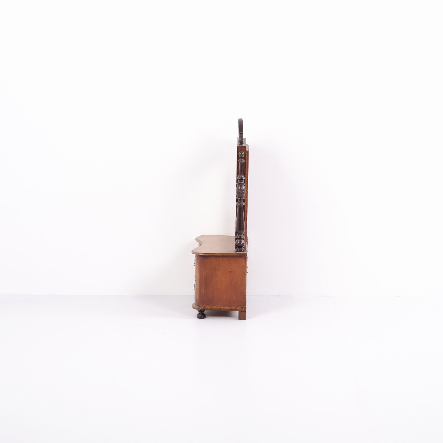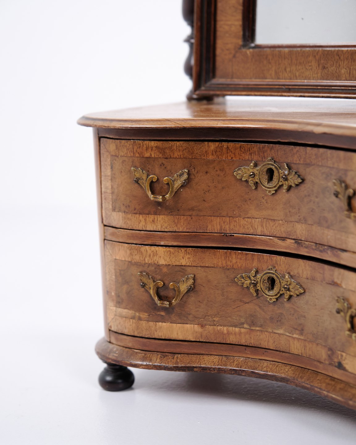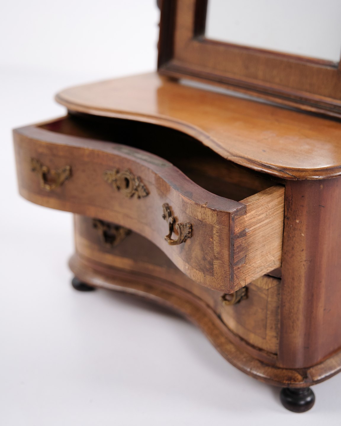 Small piece of children’s furniture from around 1860, made in mahogany with mirror and two drawers. A decorative and rare antique item with fine details, suitable for collectors or classic interiors.