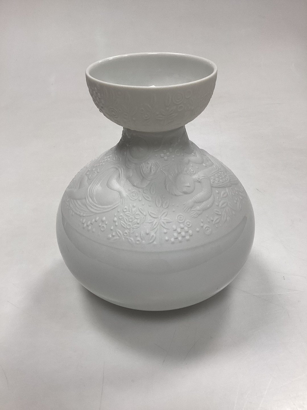 Rosenthal Bjørn Wiinblad The Magic Flute Vase. Smooth porcelain with motif in raised relief. Measures 14.2 cm / 5.59 in.