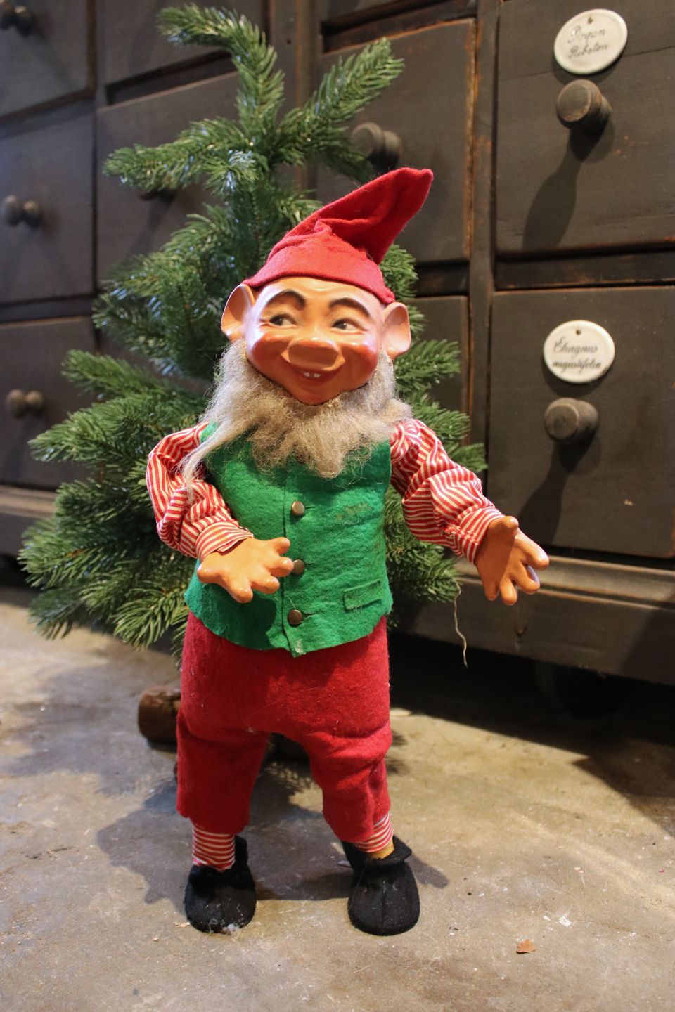 2 old shop elves with felt clothes and faces in painted papier-mâché. (Mother and Father) Height: 40cm. Sold individually!