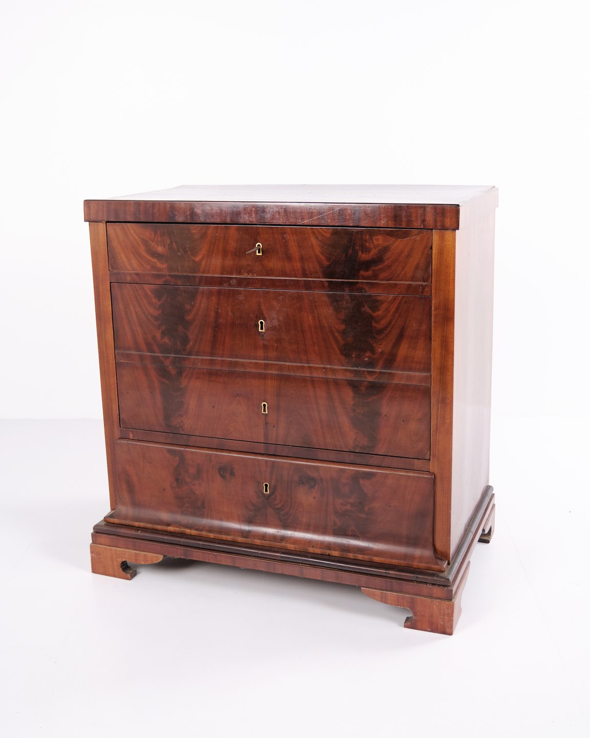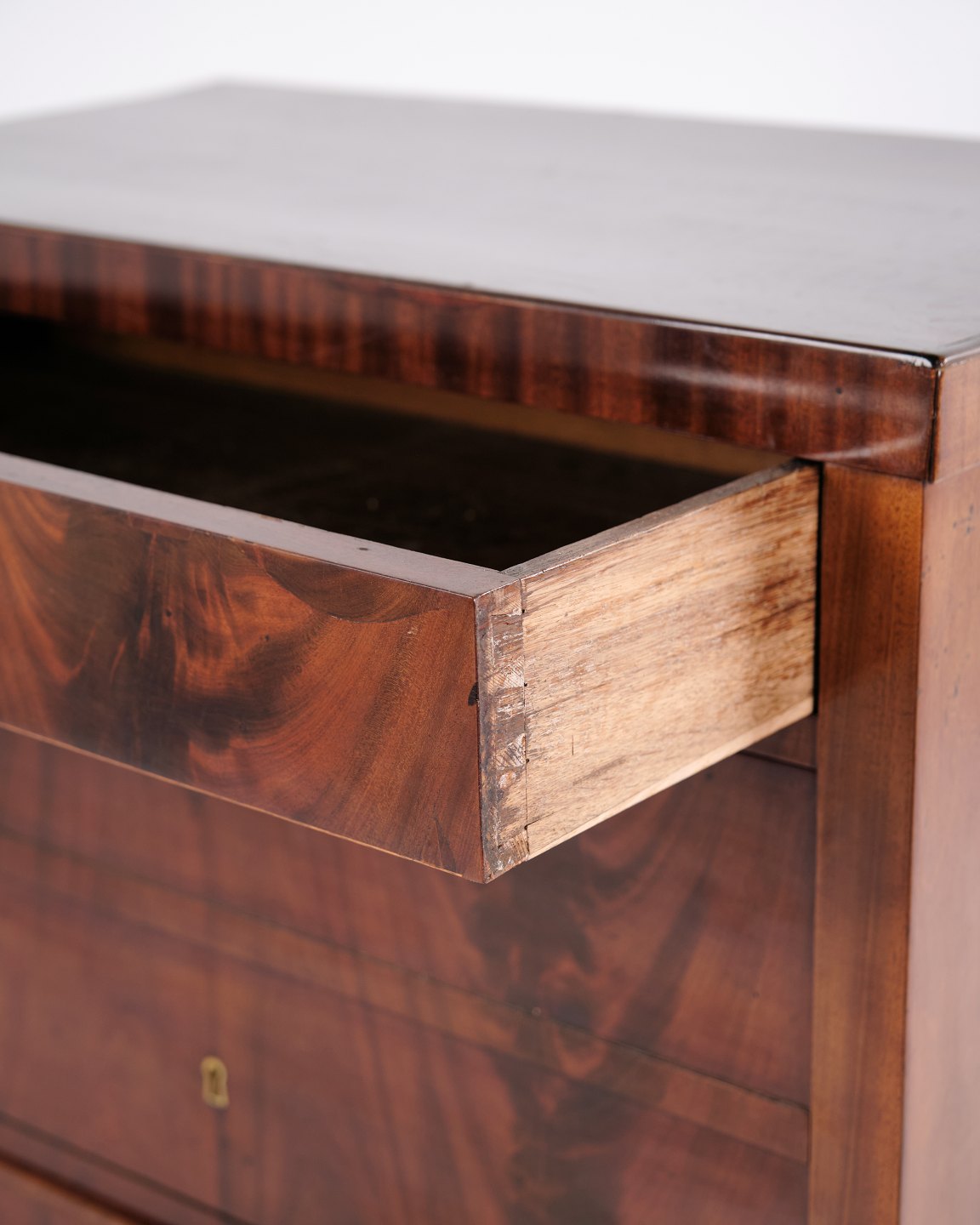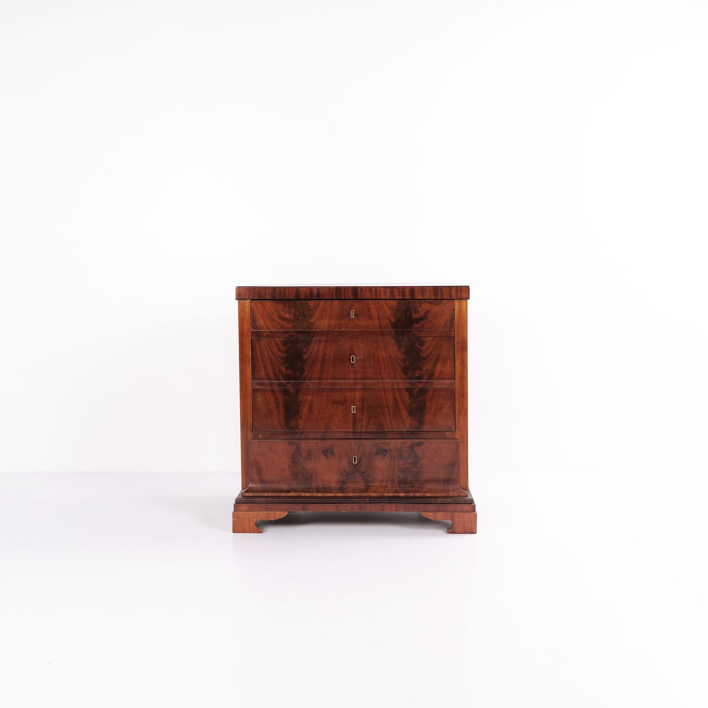 Late Empire chest of drawers from the 1840s, crafted in flame mahogany with four drawers on a plinth base. The surface has been gently French hand-polished, enhancing the depth and natural glow of the wood. A beautiful and classic antique piece from the period.