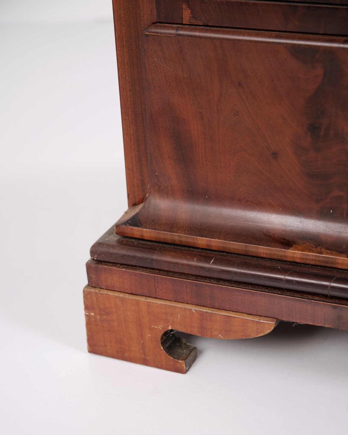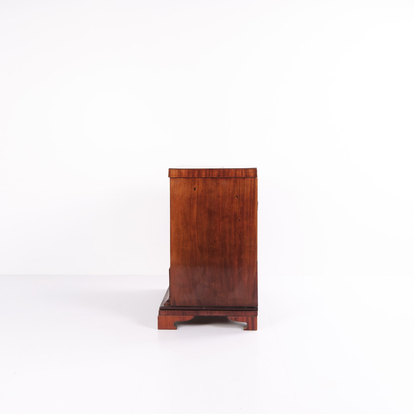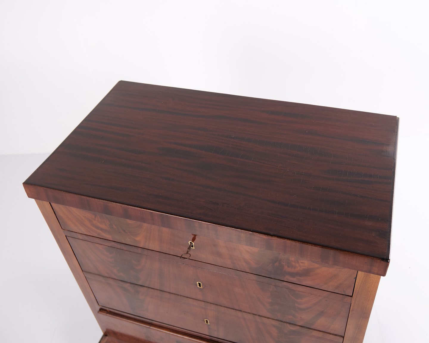 Late Empire chest of drawers from the 1840s, crafted in flame mahogany with four drawers on a plinth base. The surface has been gently French hand-polished, enhancing the depth and natural glow of the wood. A beautiful and classic antique piece from the period.