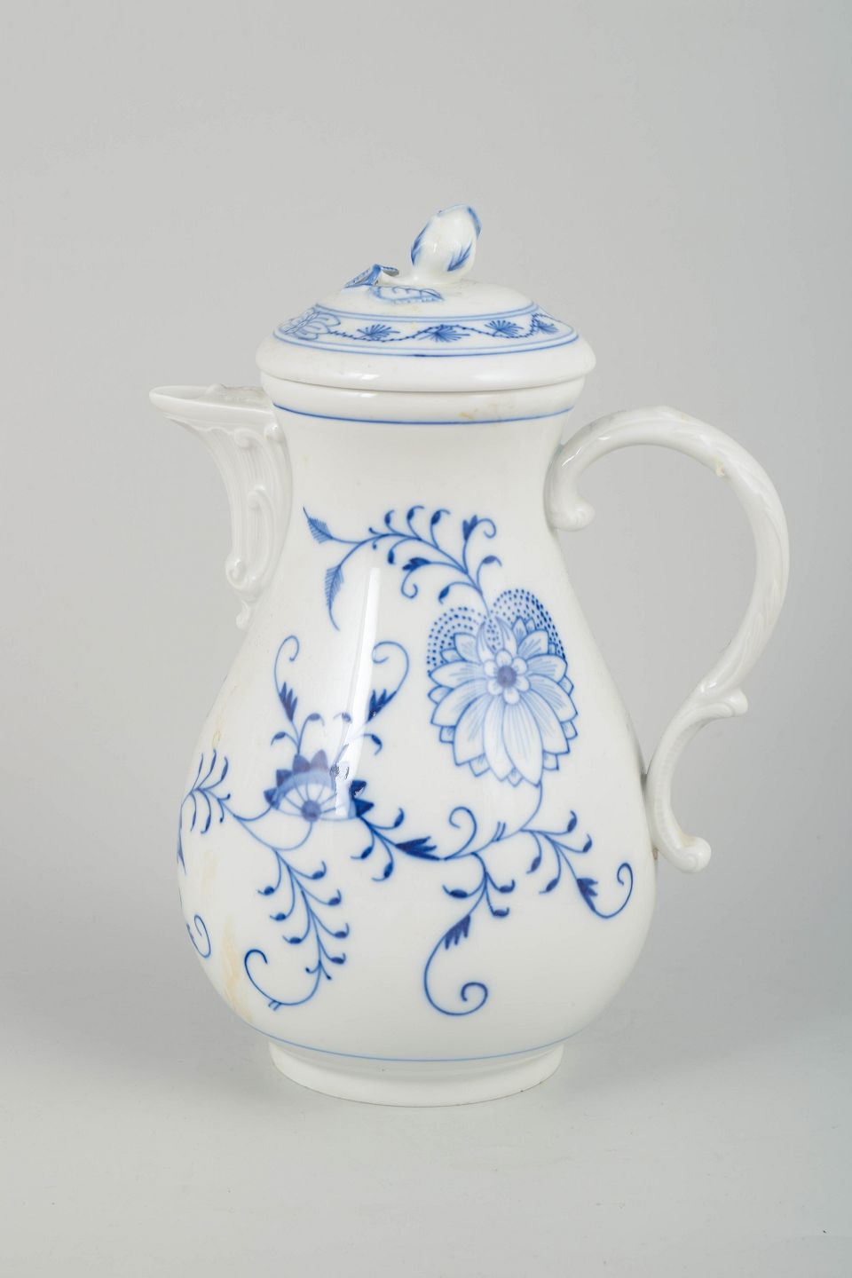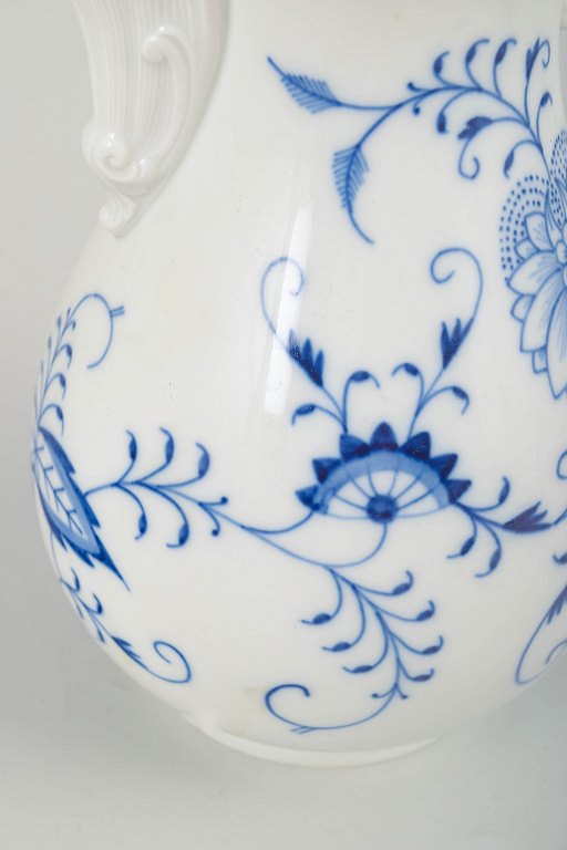 An elegant and generously shaped coffee pot in the classic Zwiebelmuster (Blue Onion) pattern, hand-painted in cobalt-blue underglaze. The curved body, pronounced handle, and original lid reflect Meissen’s characteristic design language around 1900.