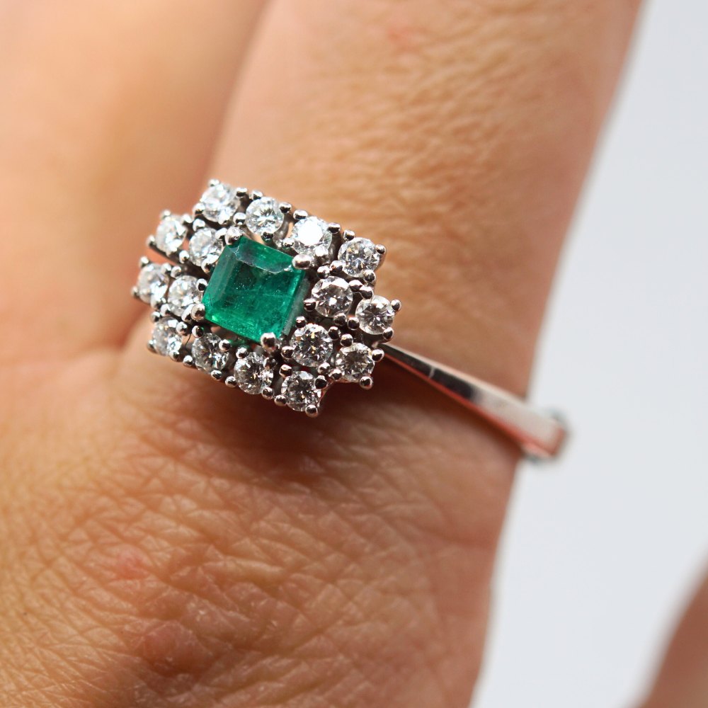 Carl Antonsen; Ring in 14k white gold, set with diamonds and emerald. Around size 61, but fleksible in size.