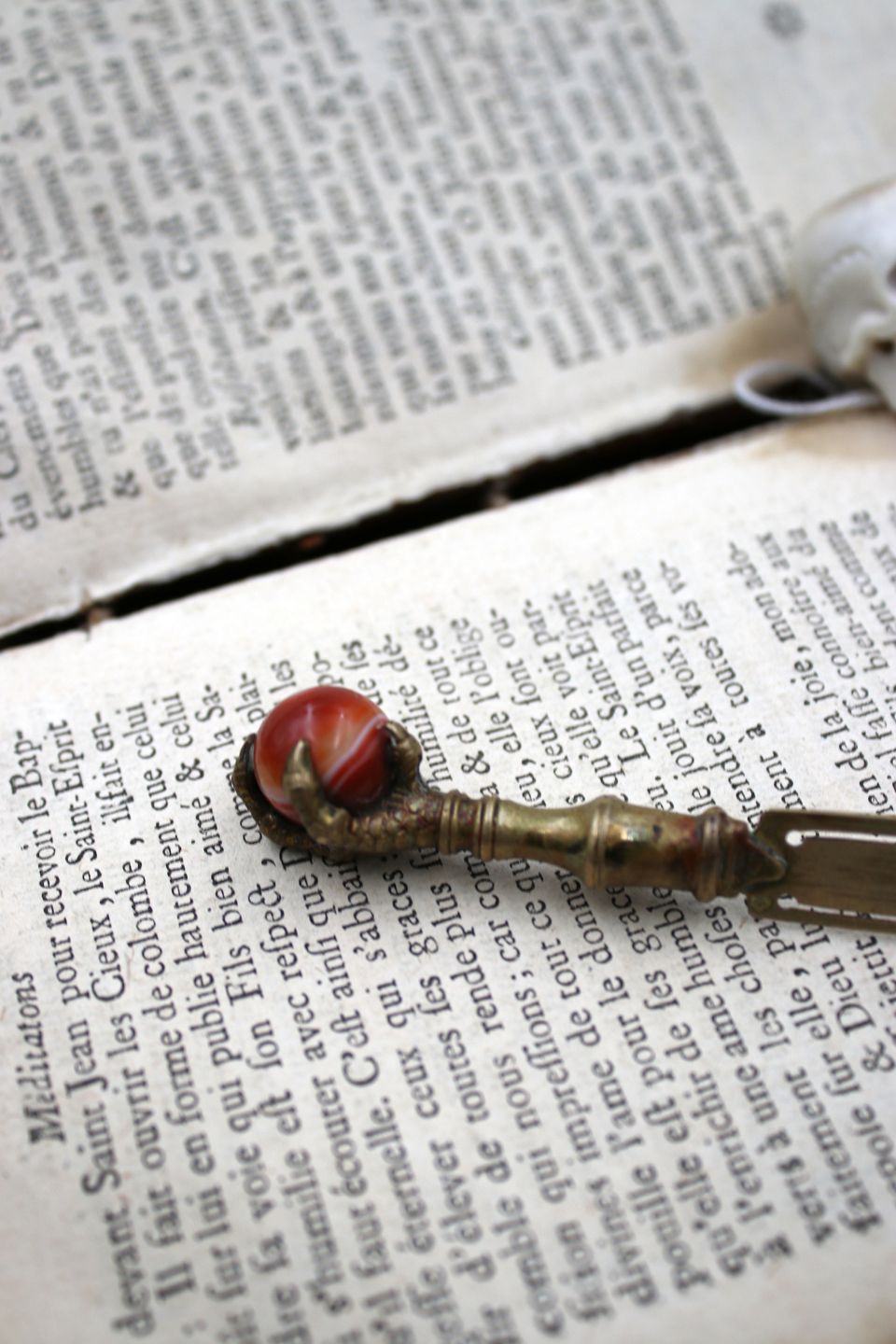 Antique 19th century brass bookmark with an eagle's claw gripping a marble ball...
