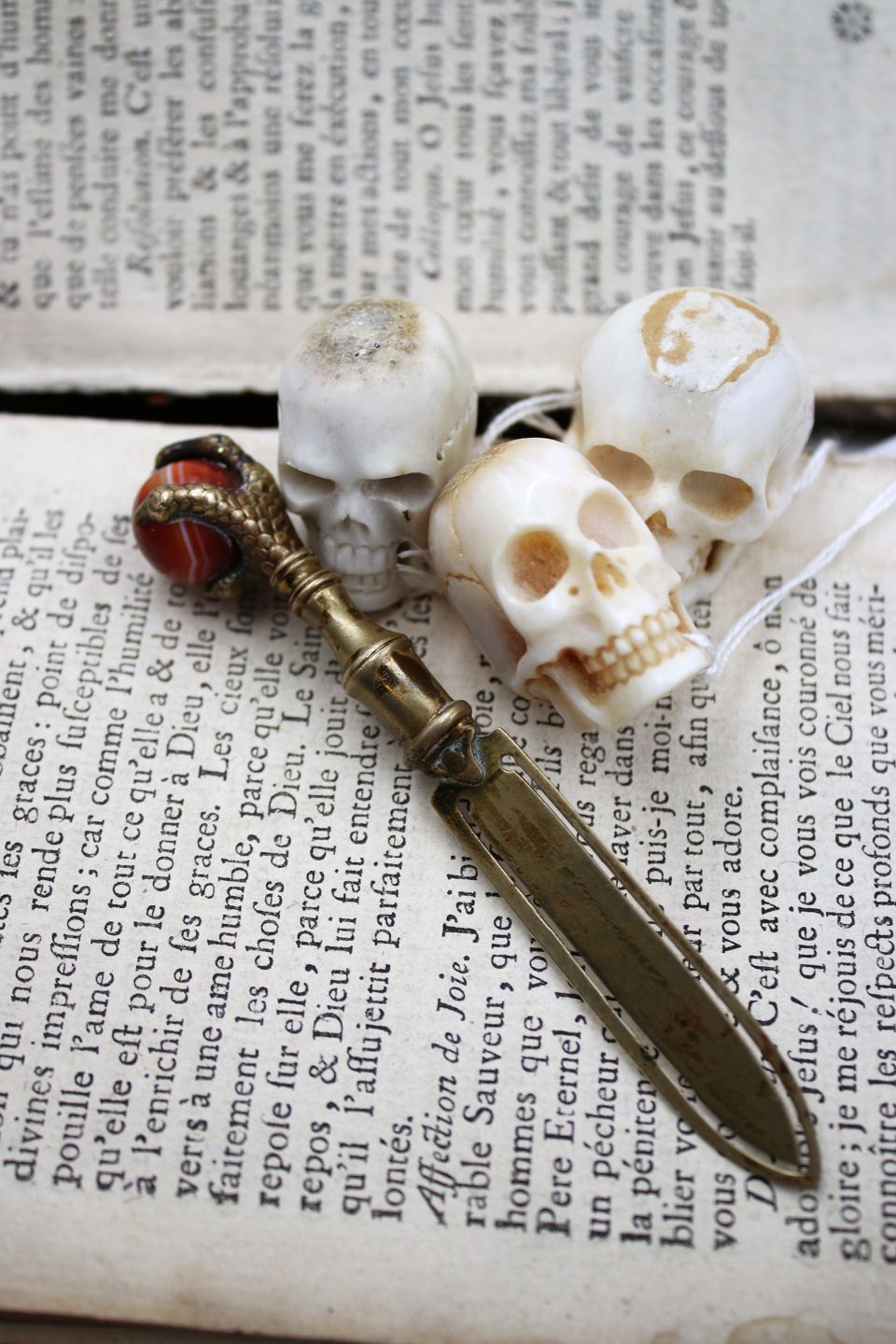 Antique 19th century brass bookmark with an eagle's claw gripping a marble ball. Length: 10cm.