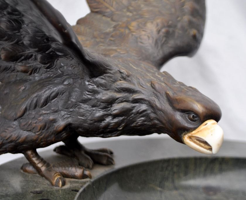 Large French bronze eagle mounted on a marble dish, art nouveau, circa 1900. Eagle with spread wings and ivory beak. Marble platter in green. Platter dia: 35 cm. Eagle: W: 40 cm. H.: 23 cm.