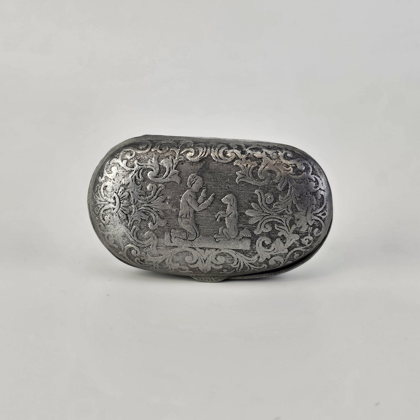 Pilleæske i tin med motiv af en dreng og en hund omgivet af bladmotiver