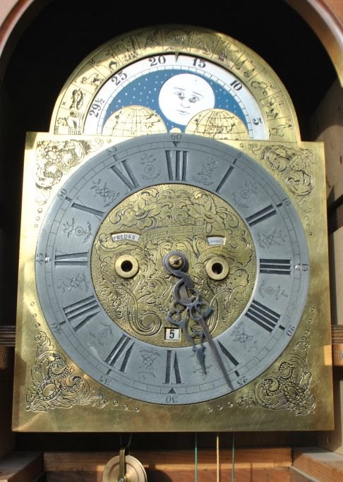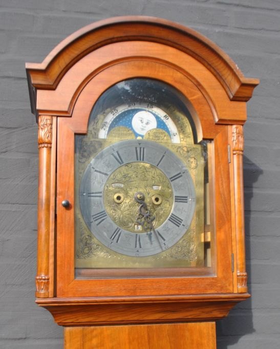 Danish grandfather clock, 20th century. Clock manufacturer and watchmaker Anker Luplau Dinesen, Randers. No.: 325. Grandfather clock in mahogany with clock case with quarter columns. Clock movement with moon phase and calendar with months and date. With hour hands. Brass dial with Roman numerals. H.: 210 cm. W.: 44 cm. D.: 24 cm.