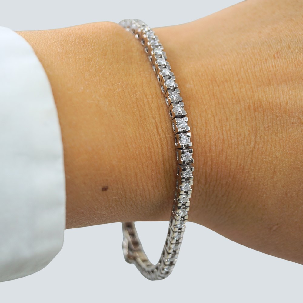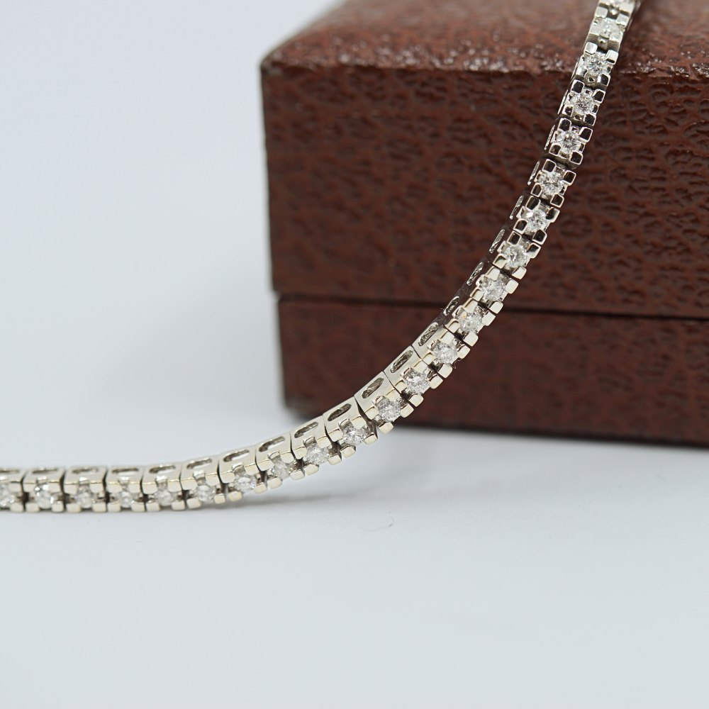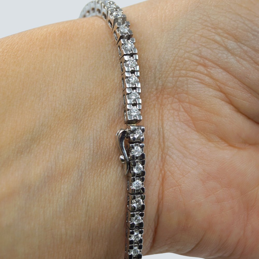 A tennis bracelet in 18k white gold set with diamonds, app. 1,53 ct. Wesselton - SI. Clasp with one safety catch.