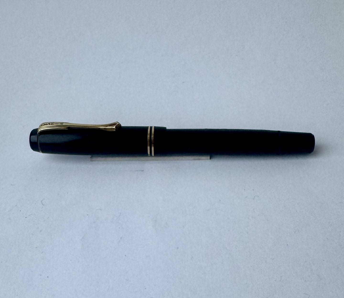 Black Osmia fountain pen with piston filler that needs to be repaired before the fountain pen can absorb ink and write again. Appears in good condition without damage. All parts original to this model including an Osmia number 2 gold nib in 14 carats. Length 11,5 cm