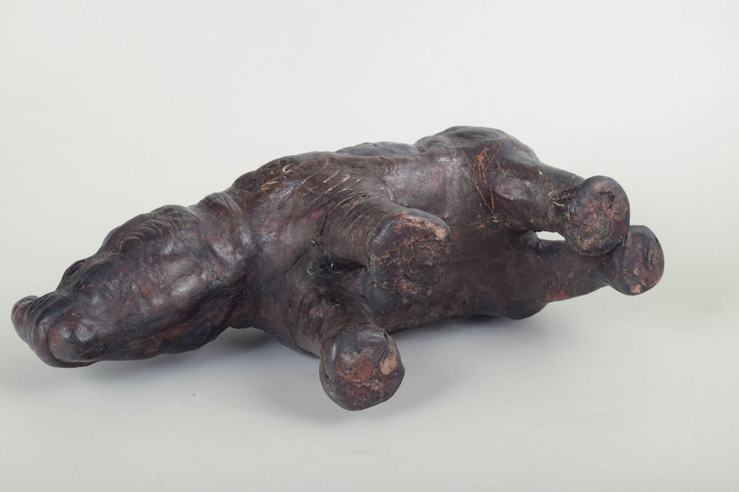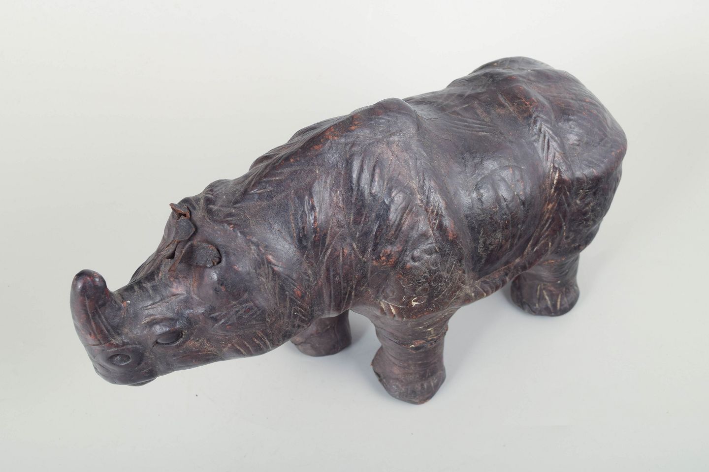 Handmade rhinoceros figure crafted in shaped and stitched leather, possibly retailed by Liberty & Co., London. Finely modelled details and natural patina emphasise the artisanal character of the piece.