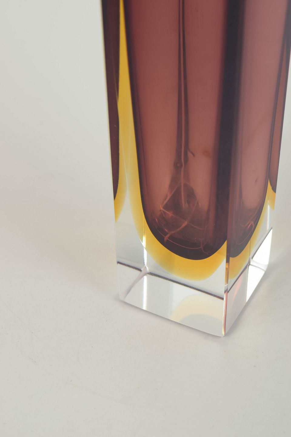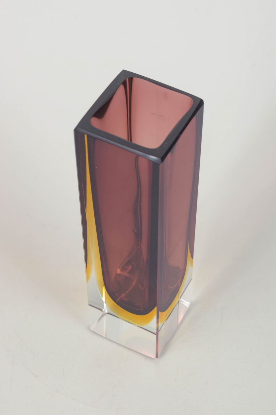 Rectangular Murano vase in layered sommerso glass, featuring a clear outer body, a deep amethyst inner core and warm yellow transitions. An elegant example of 1960s Italian glass design, characterised by sharp lines and strong optical colour effects.