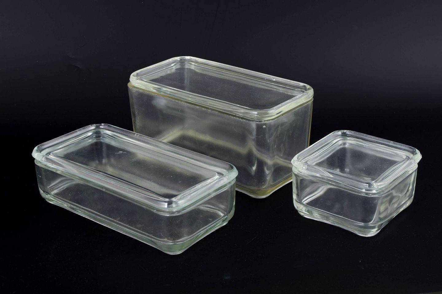 Set of three rectangular clear-glass storage boxes from Wilhelm Wagenfeld’s iconic “Kubus” series. The series exemplifies functional Bauhaus design, combining pure geometry with everyday usability. Height range 5–9 cm, length 8–18 cm.