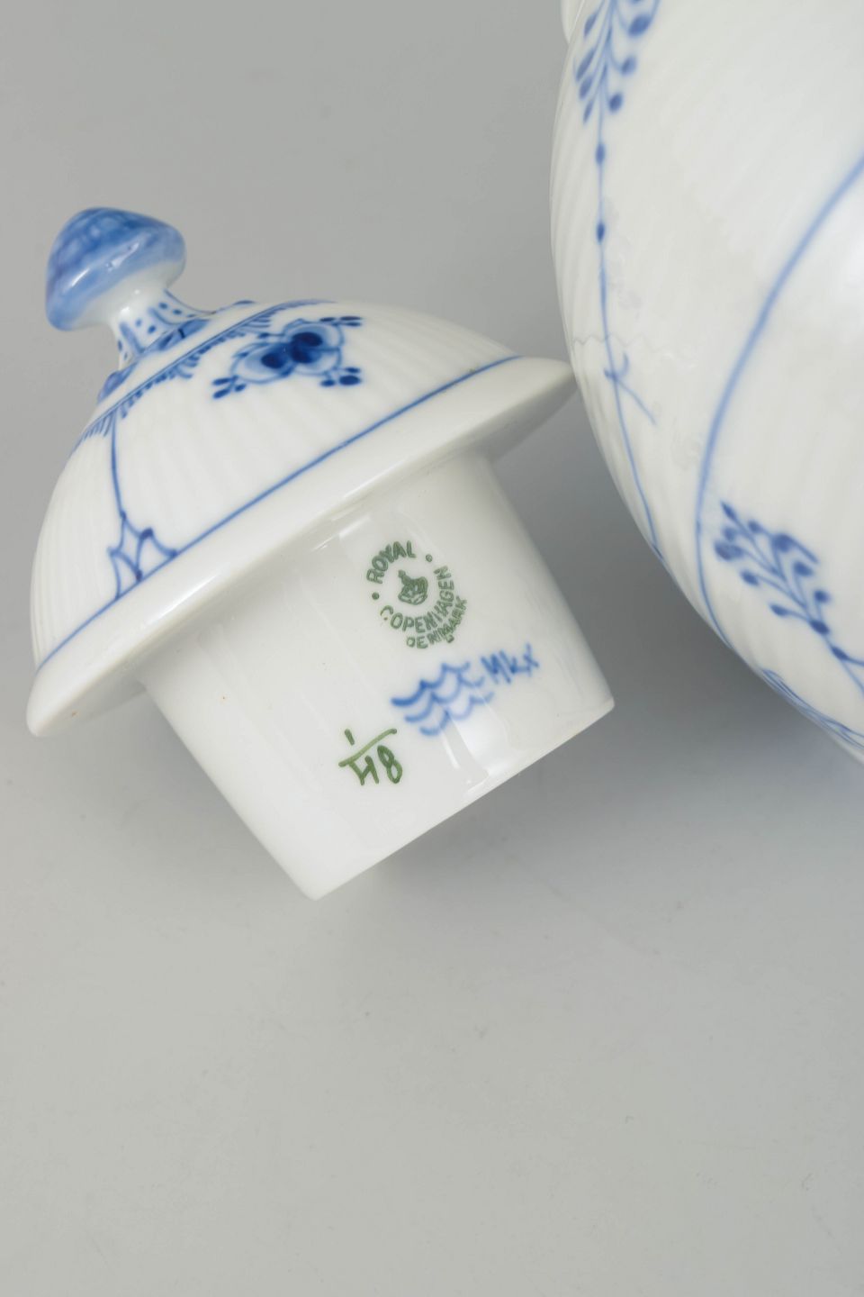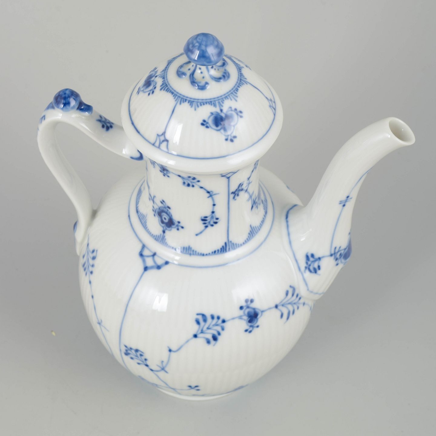 Elegant coffee pot in the classic Blue Fluted Plain pattern, model 1/48. Hand-painted decoration with fine blue details and a fluted body.