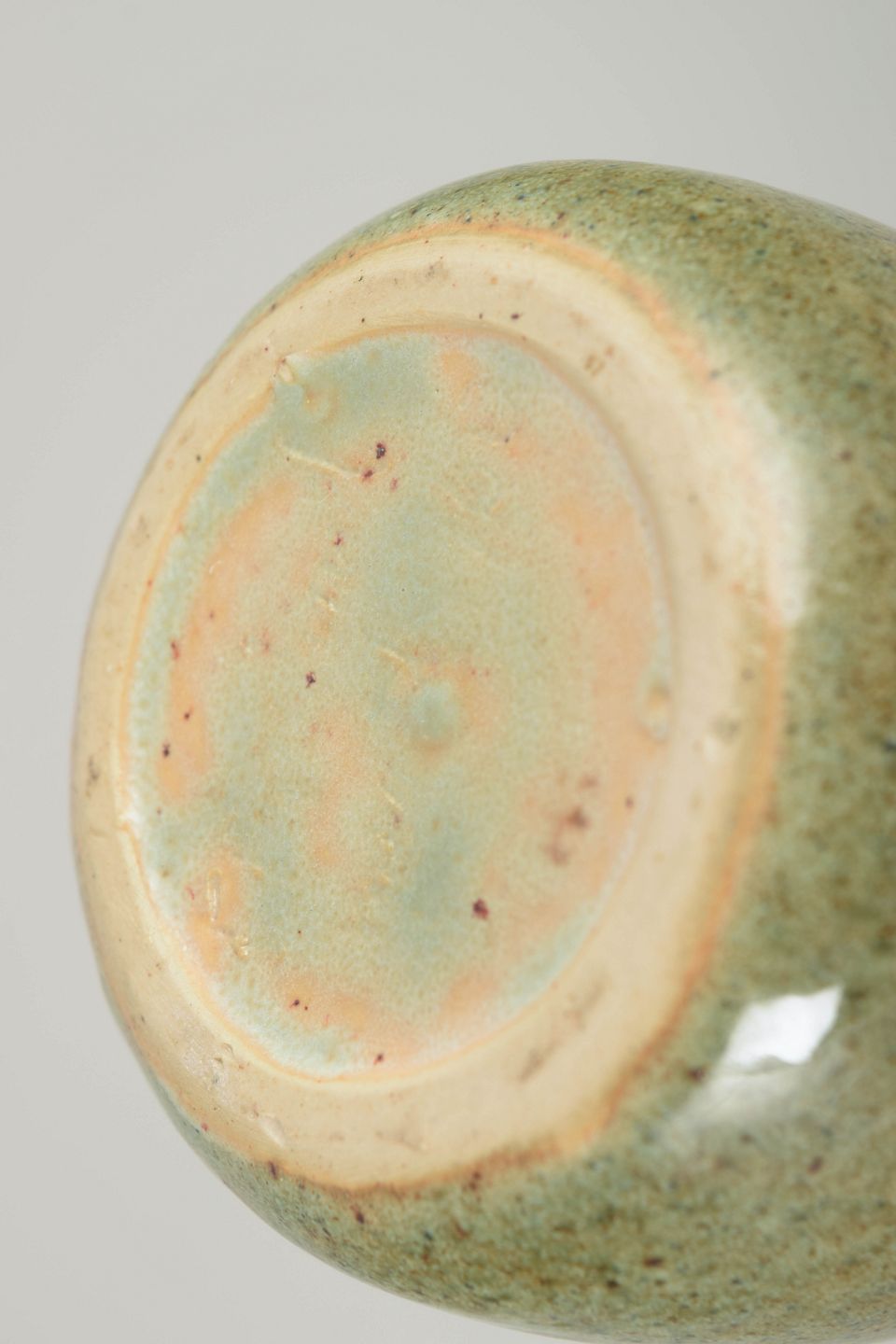 Small thrown stoneware vase with a rounded cylindrical form and a small, concentrically detailed neck. The glaze is in warm green-yellow tones with a finely speckled surface, characteristic of Scandinavian studio ceramics of the era. Signed.