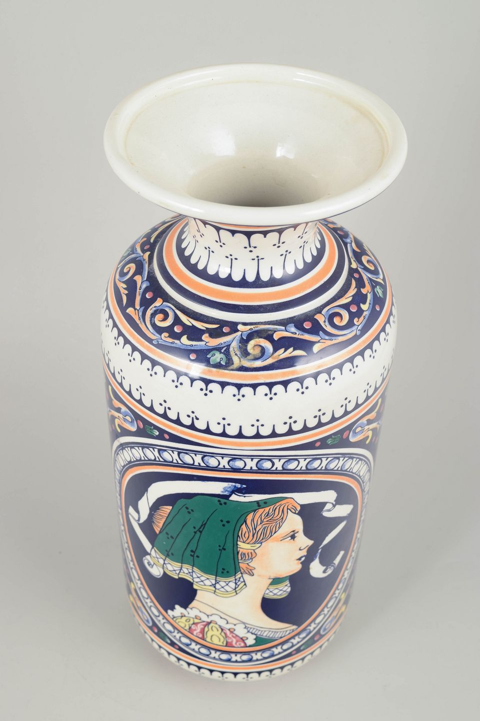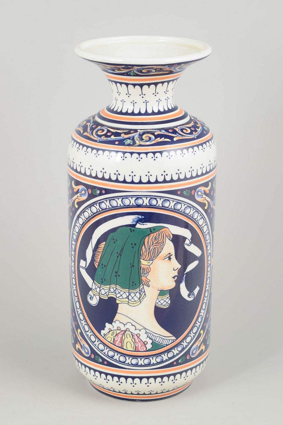 Decorative Italian majolica vase adorned using the decalcomania transfer technique, where the colourful ornamental pattern and portrait medallion are applied as transfer prints in classic majolica style.