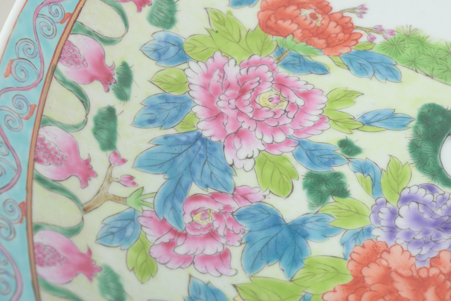 Large, monumental Chinese wall plate in porcelain, richly hand-painted with colourful birds, blossoming trees, cranes, and a sun motif. A decorative and striking piece with strong visual presence.