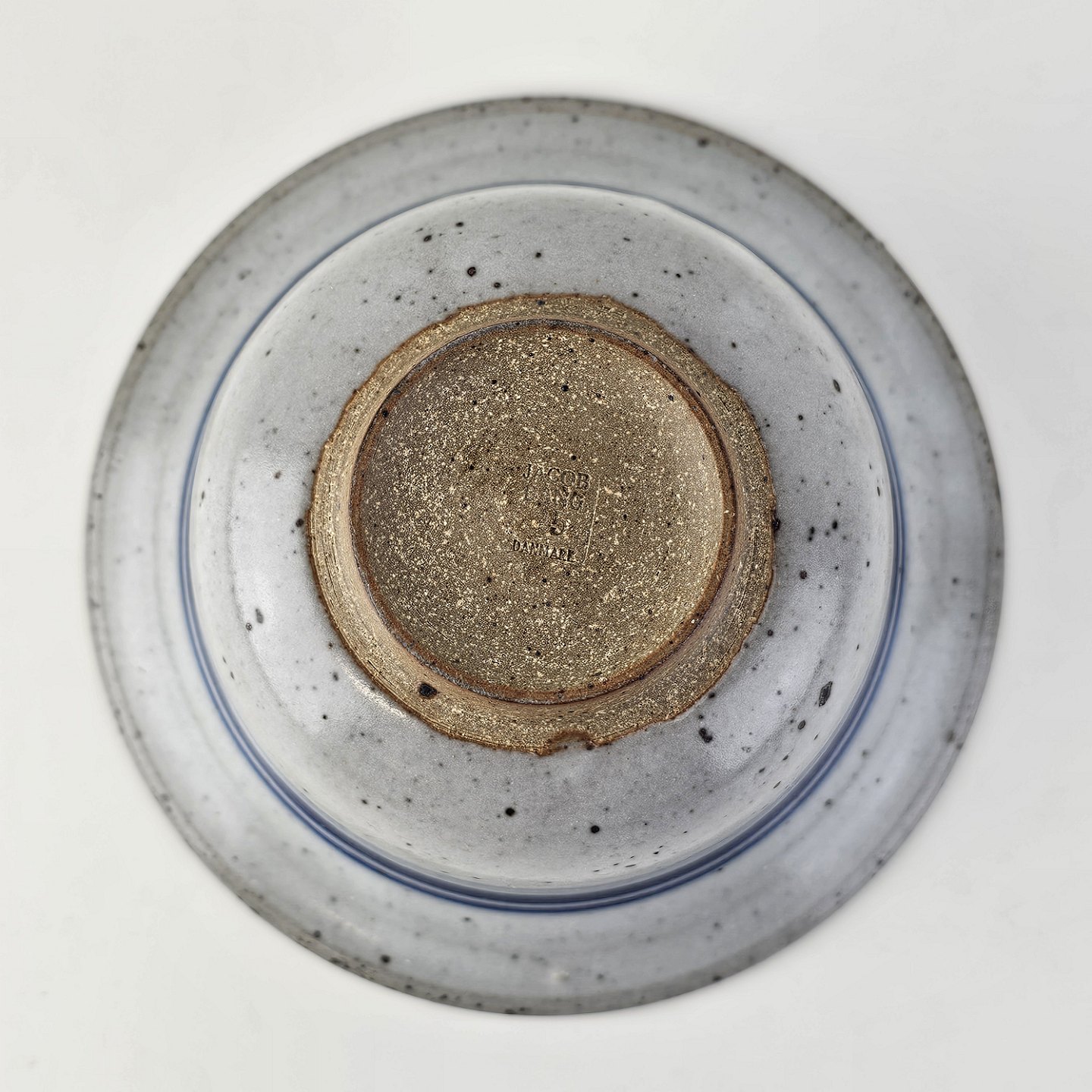 Skål i glaseret stentøj i hvide nuancer med dekoration af blå striber og en blå hvirvel i bunden