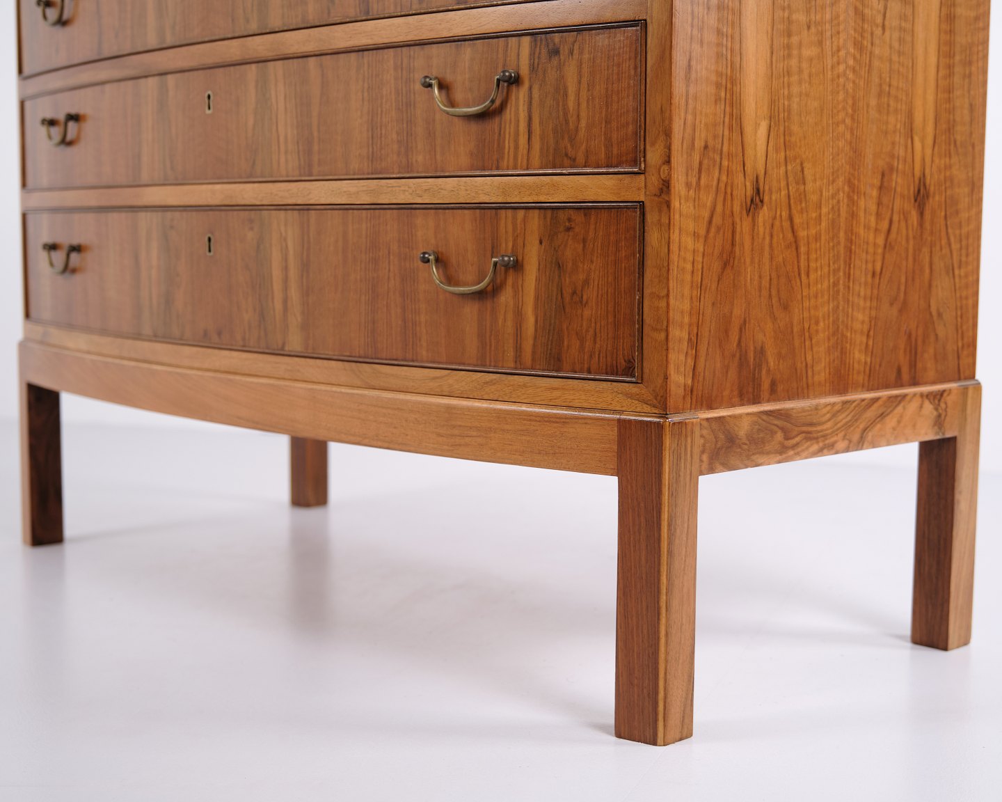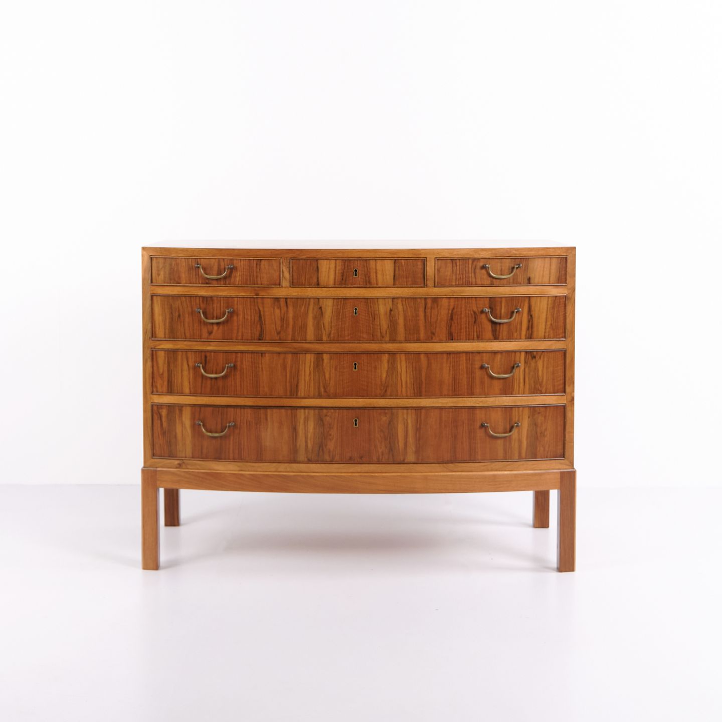 Kommode fra 1940’erne designet af Ole Wanscher. Udført i valnødfinér med messinggreb og karakteristiske detaljer fra perioden. Et tidligt eksempel på Wanschers elegante møbelkunst og brug af eksklusive materialer.